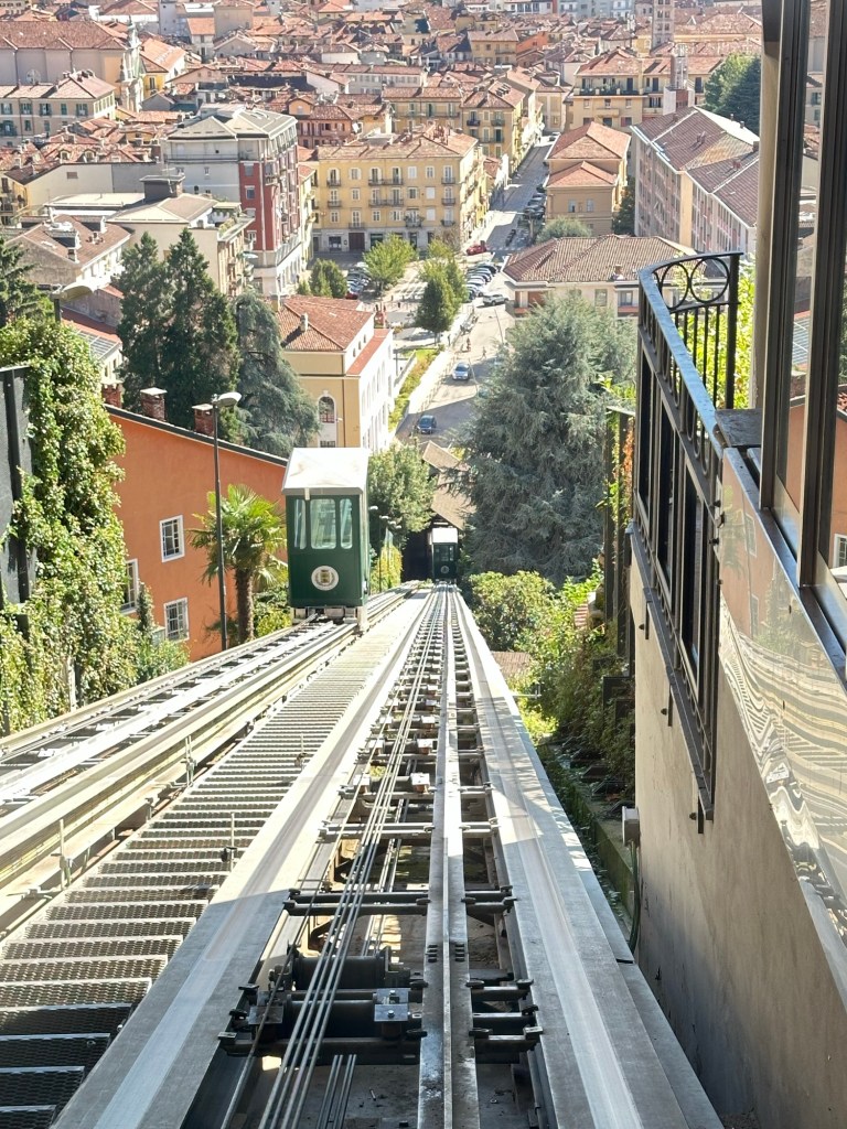 Once a wool capital of the world, Biella is not touristy, has interesting architecture, and some historical sites worthy of a peek. Biella is divided into the Piazza (upper town) and the Piano (lower town). The Piazza can be taxing by foot, but there is a funicolare (a kind of tram) linking upper and lower Biella. Ironically, once powered by water weights, the funicular was know for reliability, but now by electricity, and less so.
