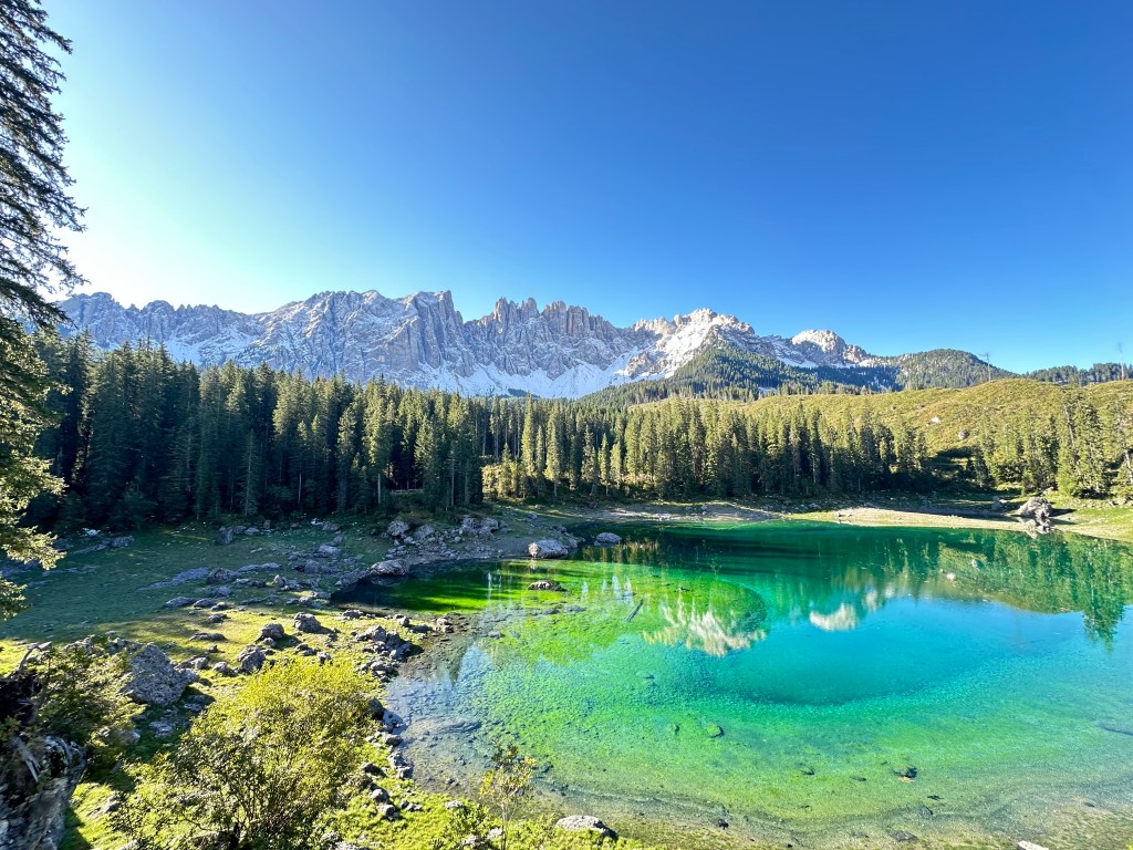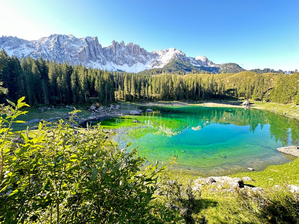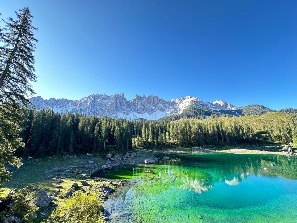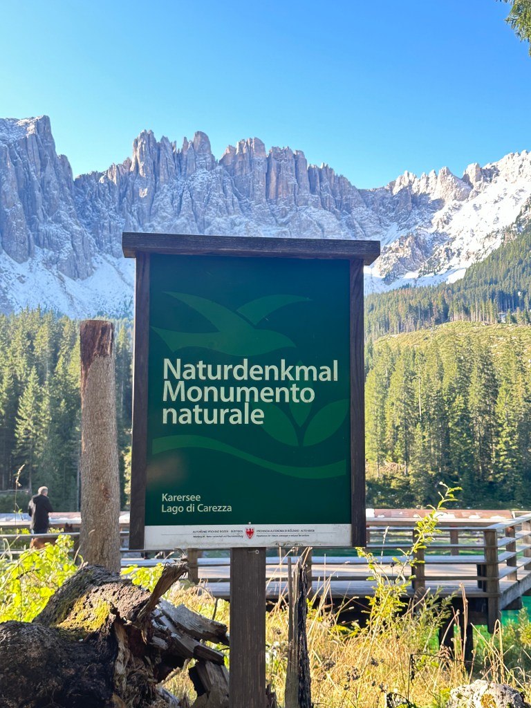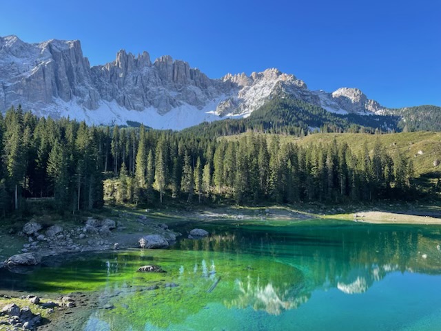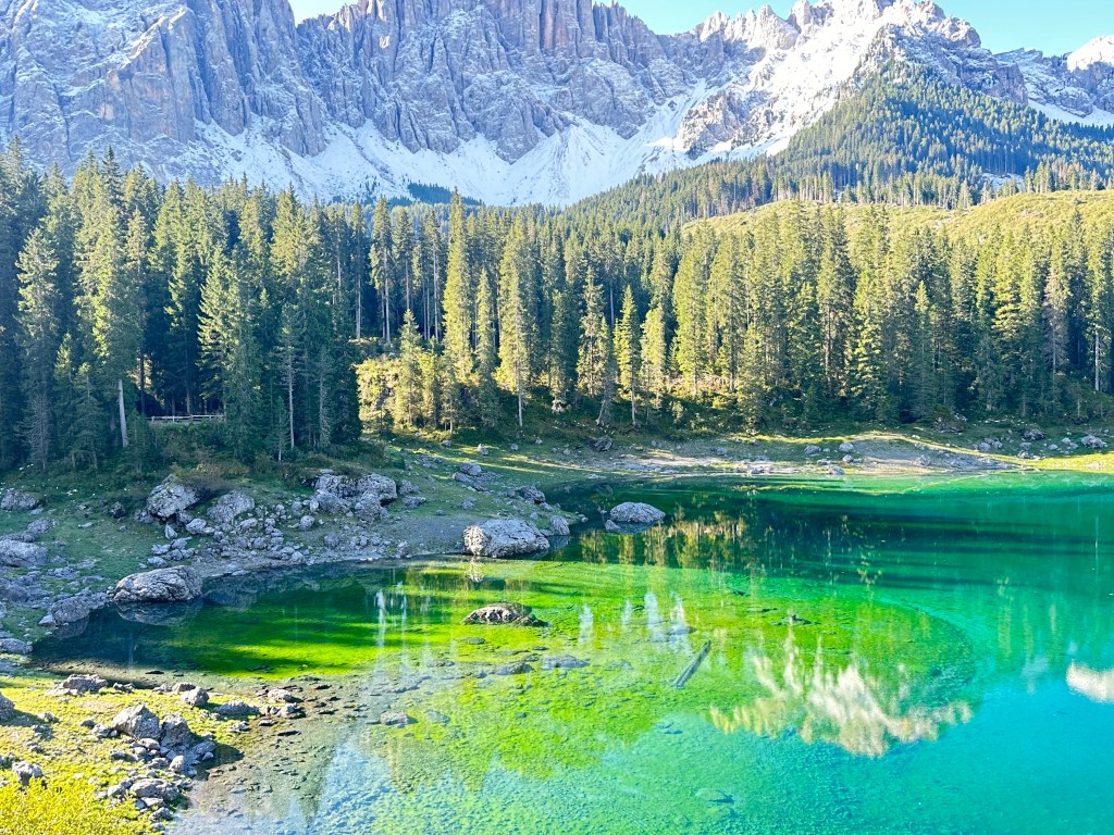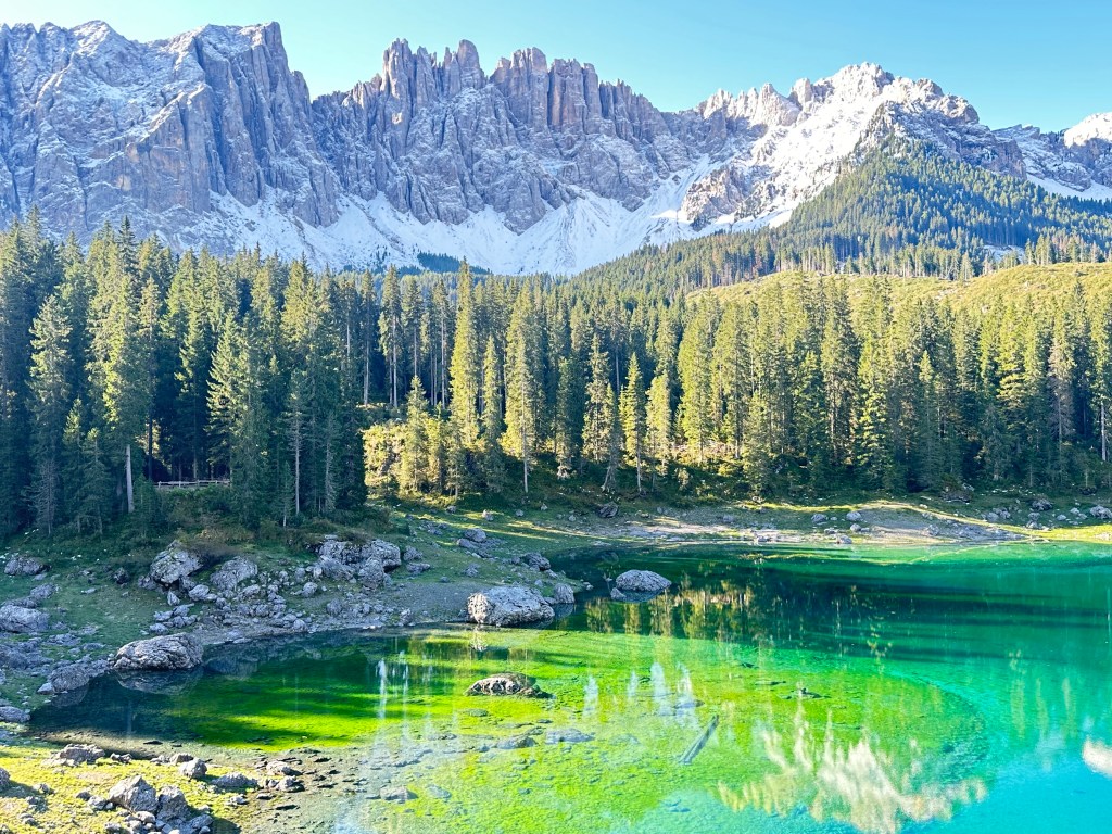 Today I was fortunate enough to be able to hike part of the Dolomites. On the way to the trailhead, I made a quick stop at Lago di Carezza, a small alpine lake in the South Tyrol region. The emerald water of Carezza, a spring fed lake, sparkles with flecks of rainbow and is framed by the Dolomite Latemar Mountain range. Unfortunately, in October 2018, a destructive storm rocked this province, felling huge swaths of trees, and it is having a substantial environmental impact in the region. However, the lake is quite stunning and it is hard to leave it.
