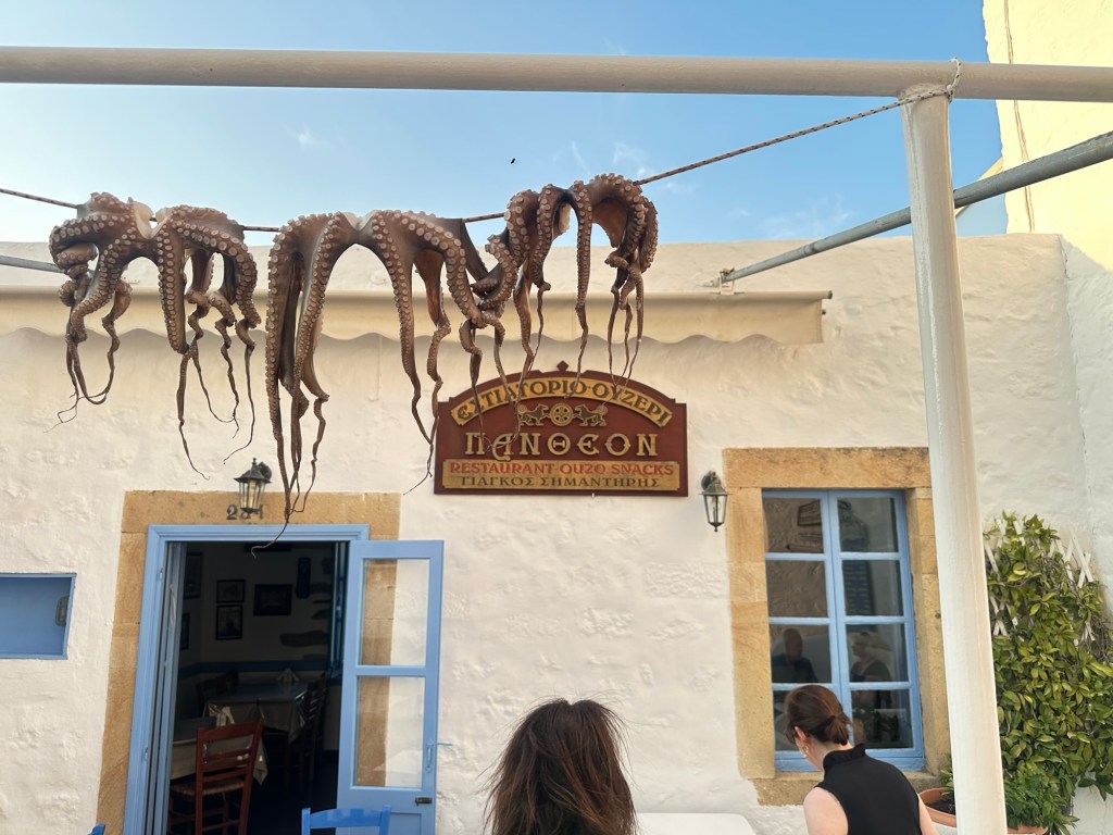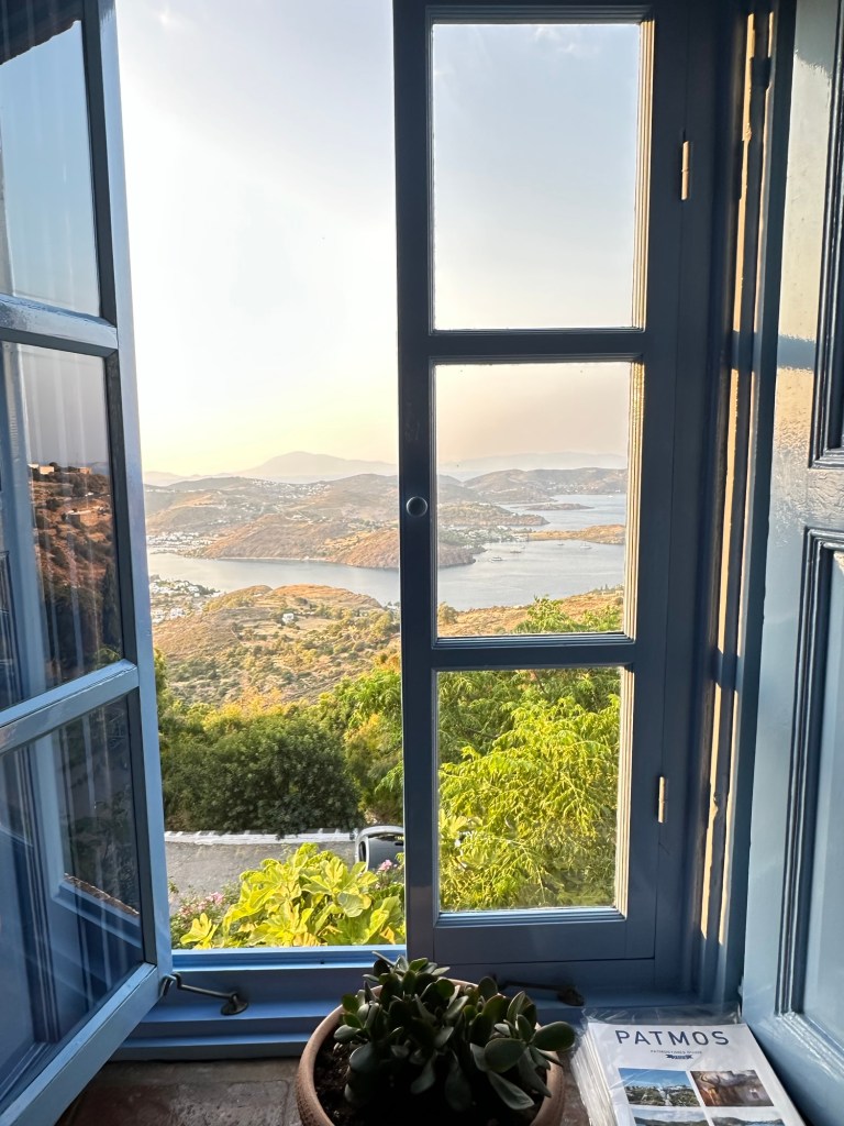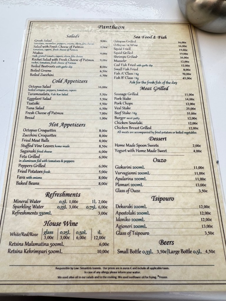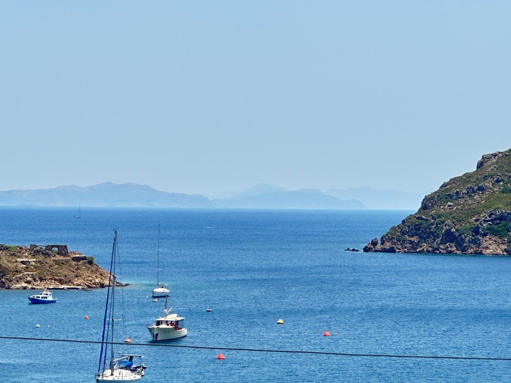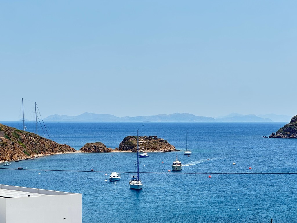 I am staying at the Petra, a small boutique hotel, owned by the woman whose name it bears. (https://www.petrahotel-patmos.com/). The Petra is built on the lower part of a hillside overlooking other Aegean islands and a small harbor flowing to and from the Aegean Sea. Upon arrival, I was greeted by Petra herself along with her staff. Apparently, Petra just started to learn English last year, but her English is good enough to get things going. My suite is a jewel – simple but elegant in a Greek way. The hot tub in the small attached court yard is a nice touch, but I have not yet used it. Instead, when I arrived I headed right for the sun deck and pool for an afternoon of chill and some local fare.