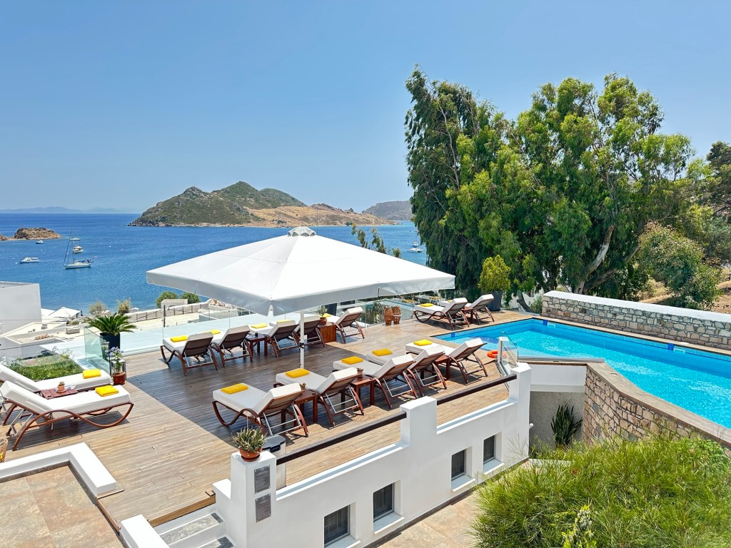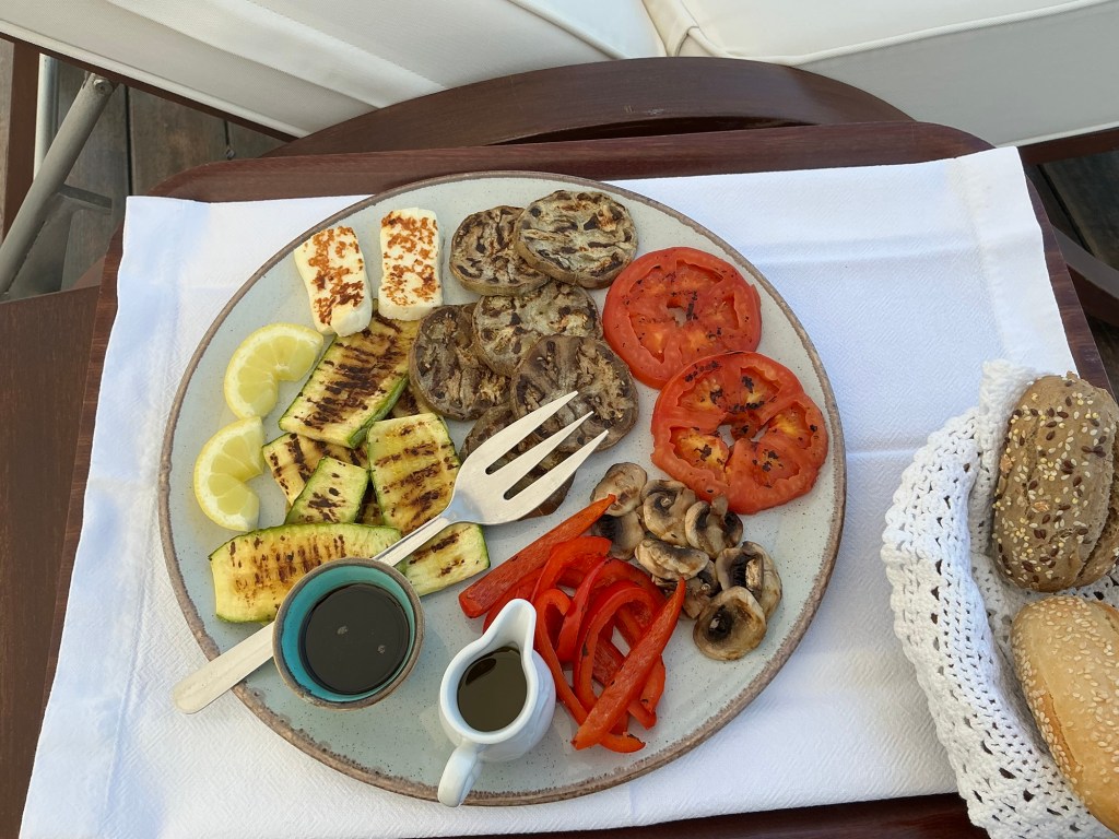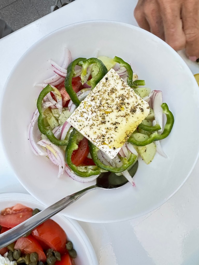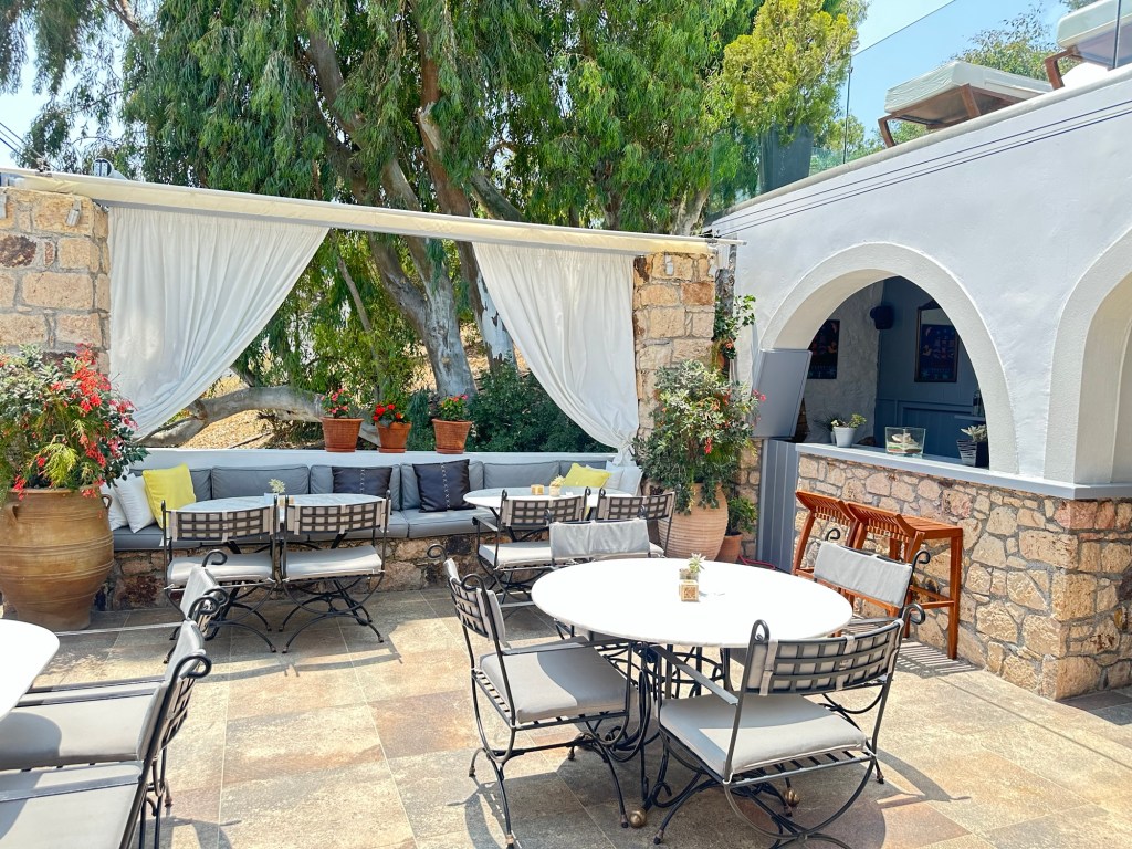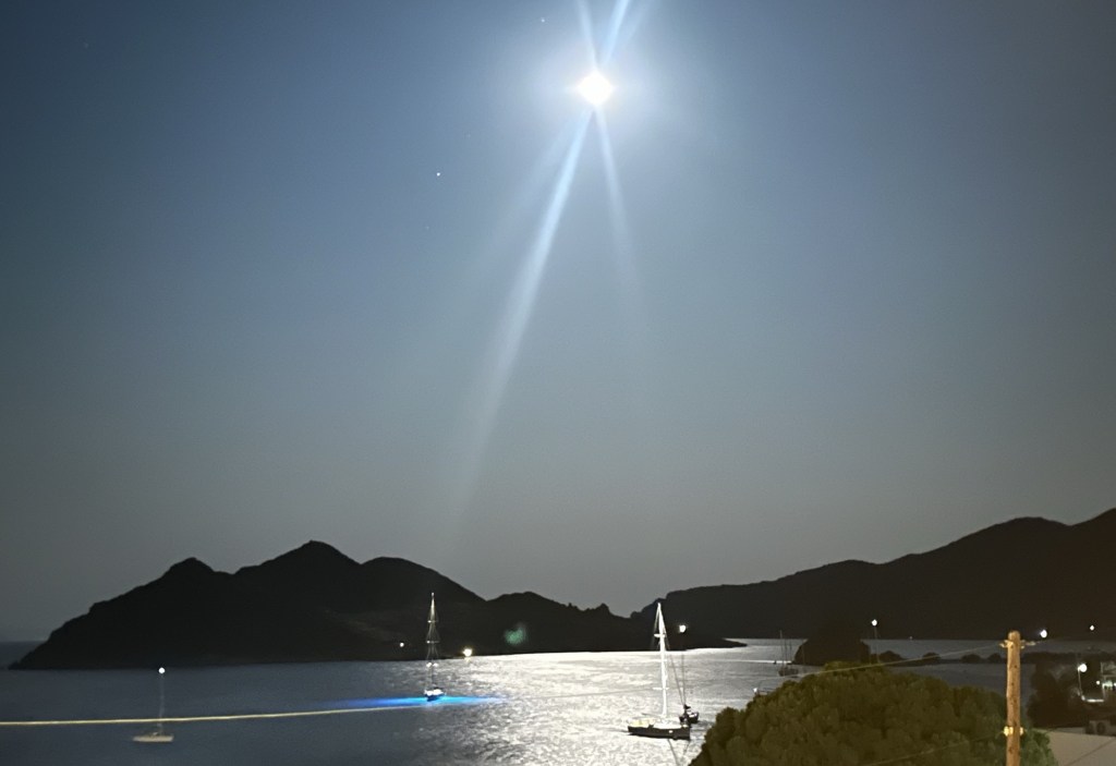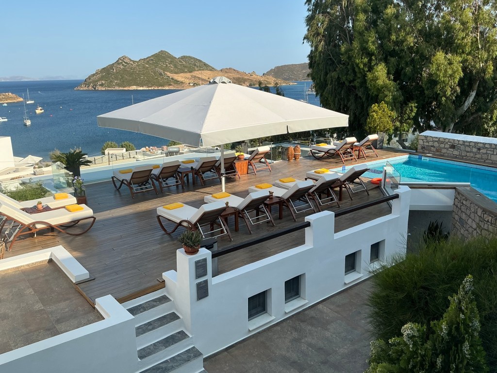 I am staying at the Petra, a small boutique hotel, owned by the woman whose name it bears. (https://www.petrahotel-patmos.com/). The Petra is built on the lower part of a hillside overlooking other Aegean islands and a small harbor flowing to and from the Aegean Sea. Upon arrival, I was greeted by Petra herself along with her staff. Apparently, Petra just started to learn English last year, but her English is good enough to get things going. My suite is a jewel – simple but elegant in a Greek way. The hot tub in the small attached court yard is a nice touch, but I have not yet used it. Instead, when I arrived I headed right for the sun deck and pool for an afternoon of chill and some local fare.