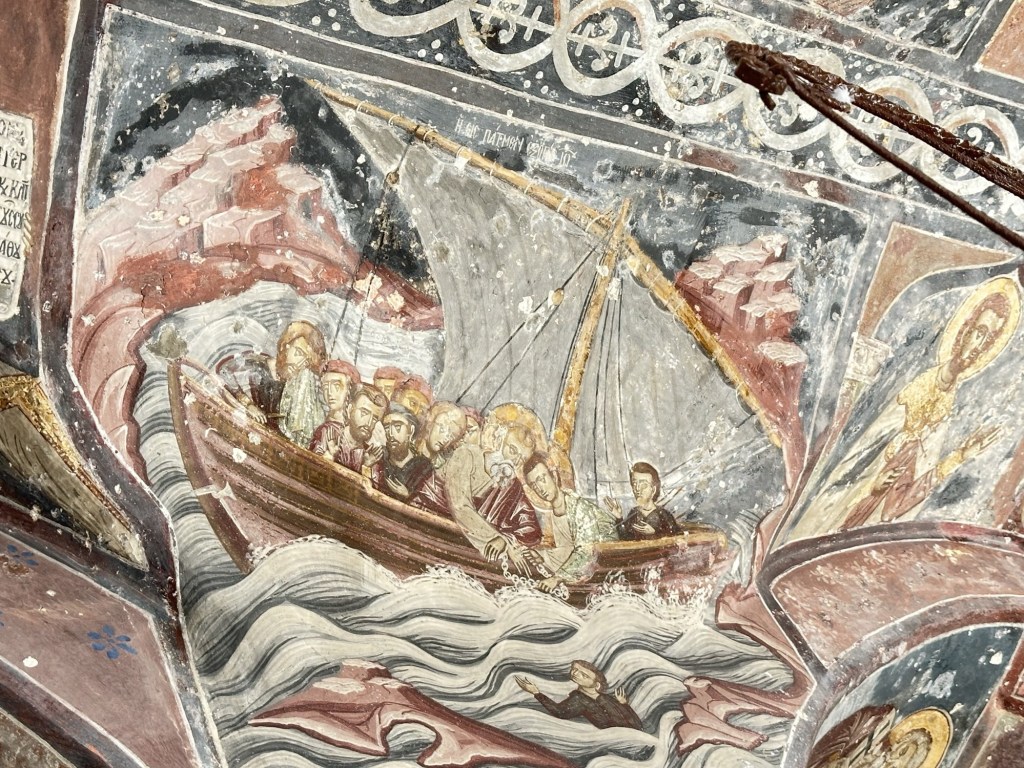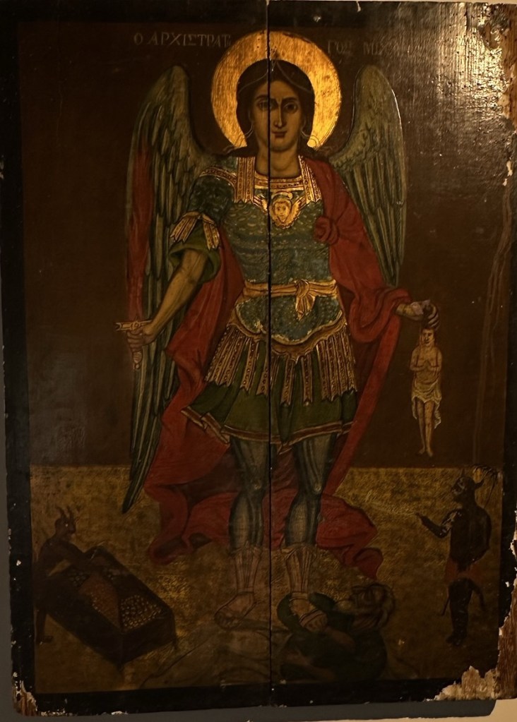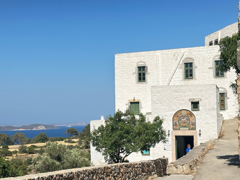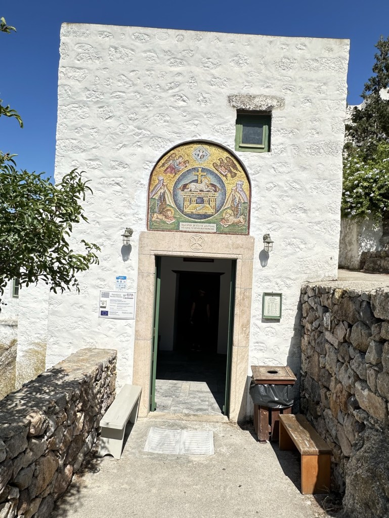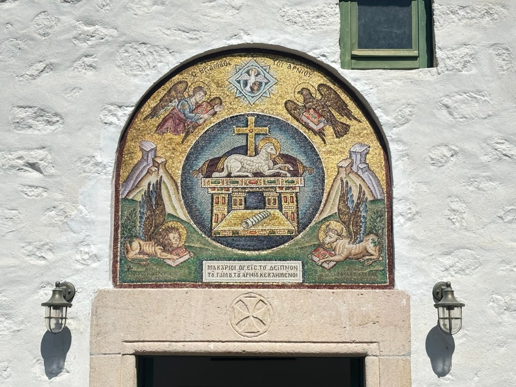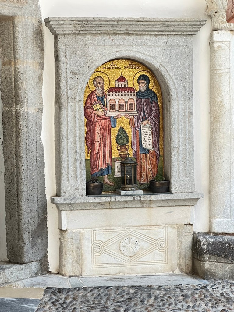 At the center of it all stands the Monastery of Saint John, a fortified structure founded in 1088. In 1088, Byzantine Emperor Alexios I Komnenos gave the island of Patmos to a monk, Christodoulos Latrinos. The greater part of the monastery was completed by Christodoulos three years later. He heavily fortified the exterior because of the threats of piracy and Seljuk Turks. Since the Covid period, most of the interior of the Monastery is not open to the public. That which is open provides a glimpse a richly decorated church, gold-encrusted icons, along with a silver coffin said to hold the bones of Christodoulos. An attached Museum holds historic artifacts of the Monastery.