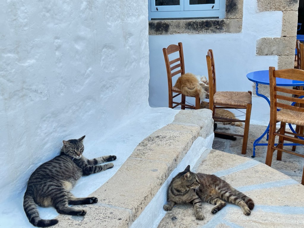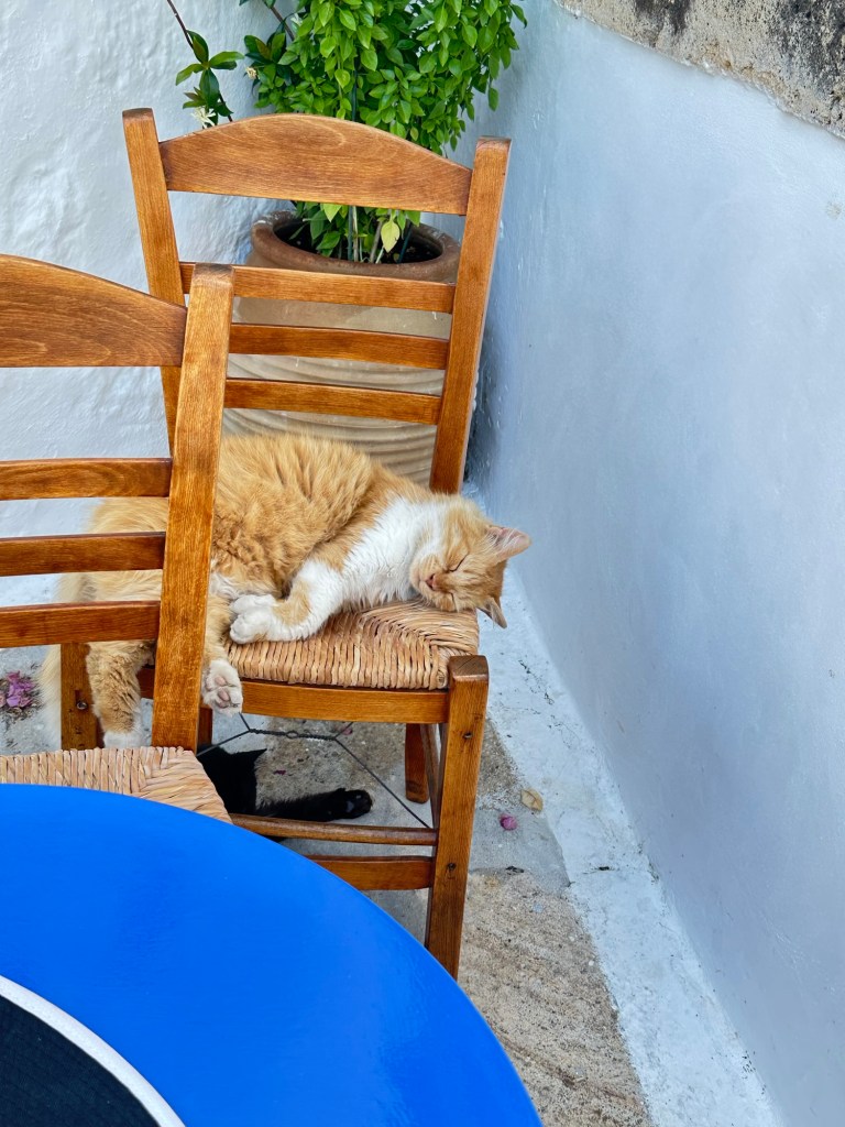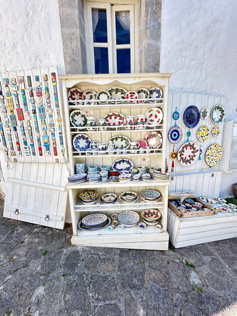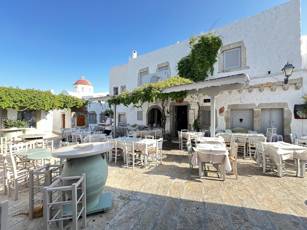 Nicholas takes us through the streets of Chora. The streets are too narrow for cars, and the village must be explored on foot, heightening the sense of discovery. Arched passageways, secluded courtyards, and elegant mansions—many dating back to the 16th and 17th centuries—reflect the village’s prosperous past as a spiritual and trading hub. Sadly, Nicholas tells us that only 10% of Chora is owned by locals, and that most of the houses are in the hands of Americans and Italians, who summer here.