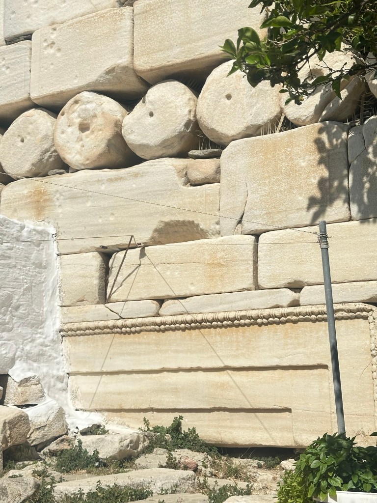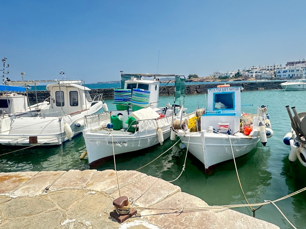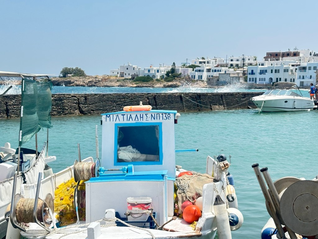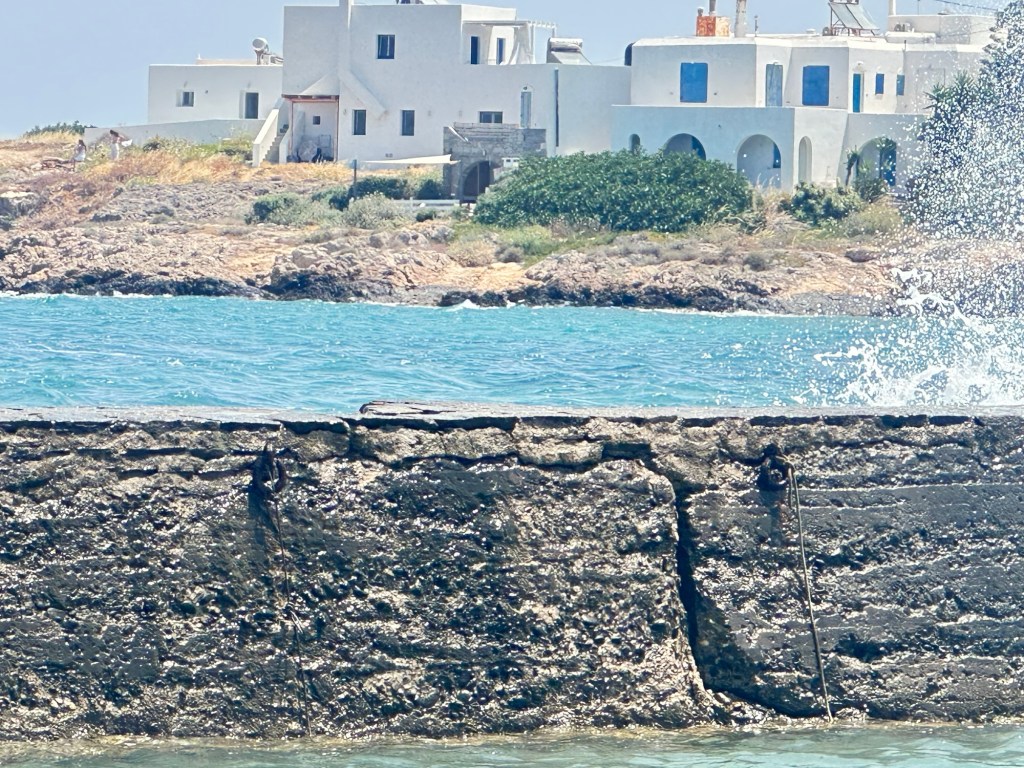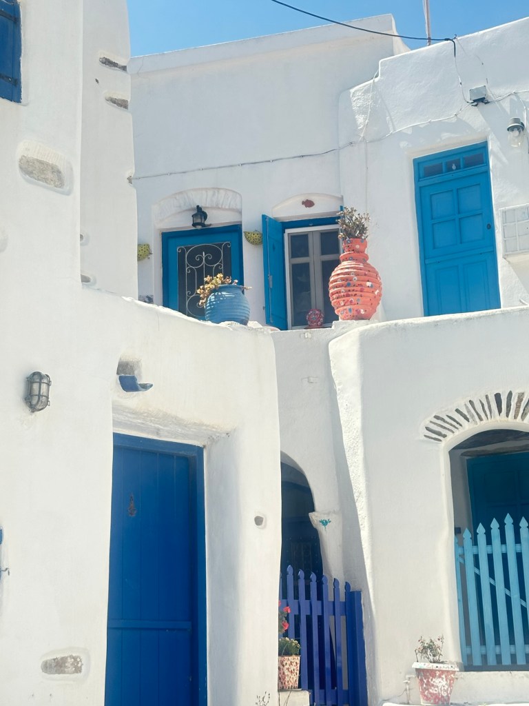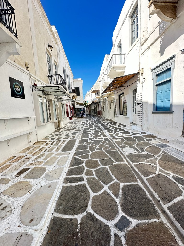 Evi first takes us to Parikia, the main port of Paros. Parikia spills around a natural bay on the island’s western coast. Whitewashed houses with cobalt shutters crowd the hillside, their flat roofs catching the Aegean sun. Narrow stone alleys twist through the town like a labyrinth, shaded by vines and bougainvillea that spill over balconies. Parts of ancient structures are repurposed into newer older ones. The streets are alive with a gentle rhythm—scooters hum by, shopkeepers chat in doorways, and cats nap in cool corners.