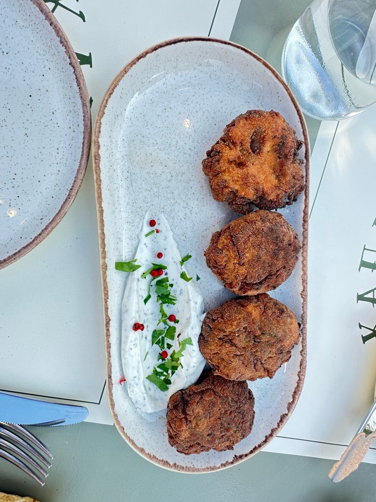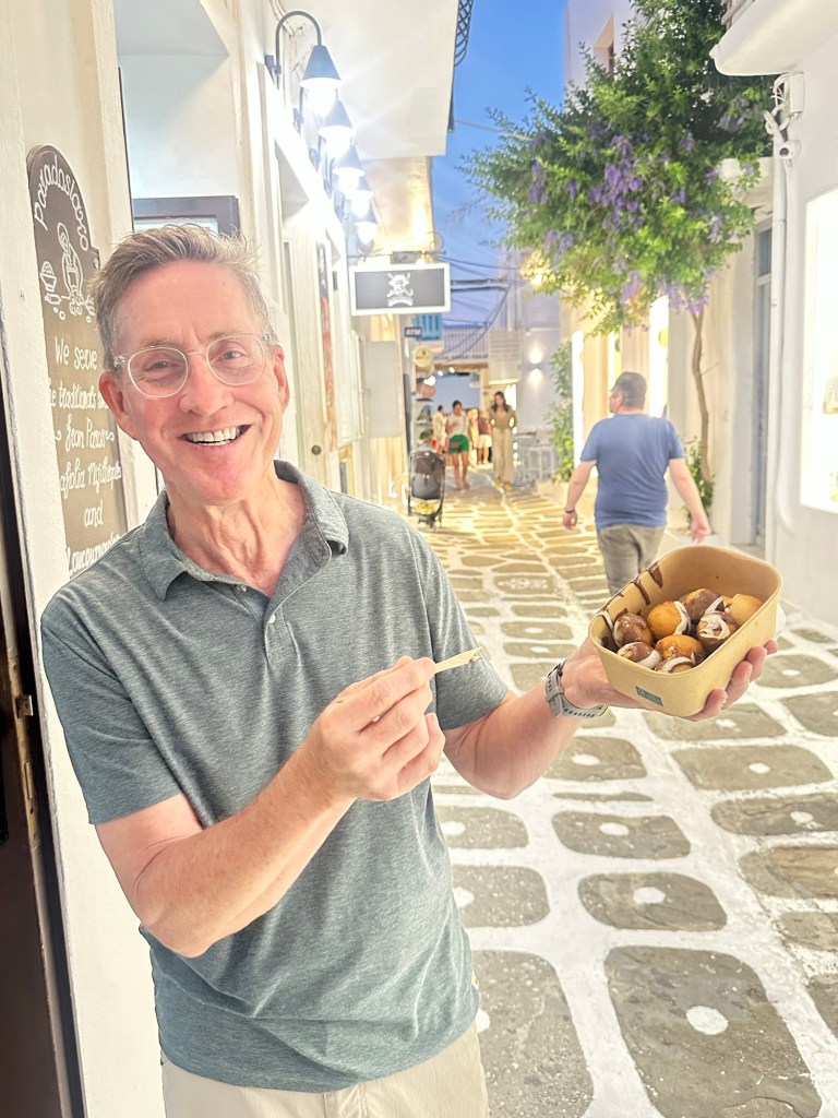 On the way back to the hotel, we discover Loucourmades, a traditional Greek dessert—golden, bite-sized dough balls that are fried until crisp on the outside and fluffy on the inside, then drenched in honey syrup and often sprinkled with cinnamon and crushed walnuts.
