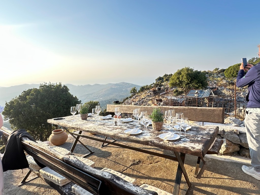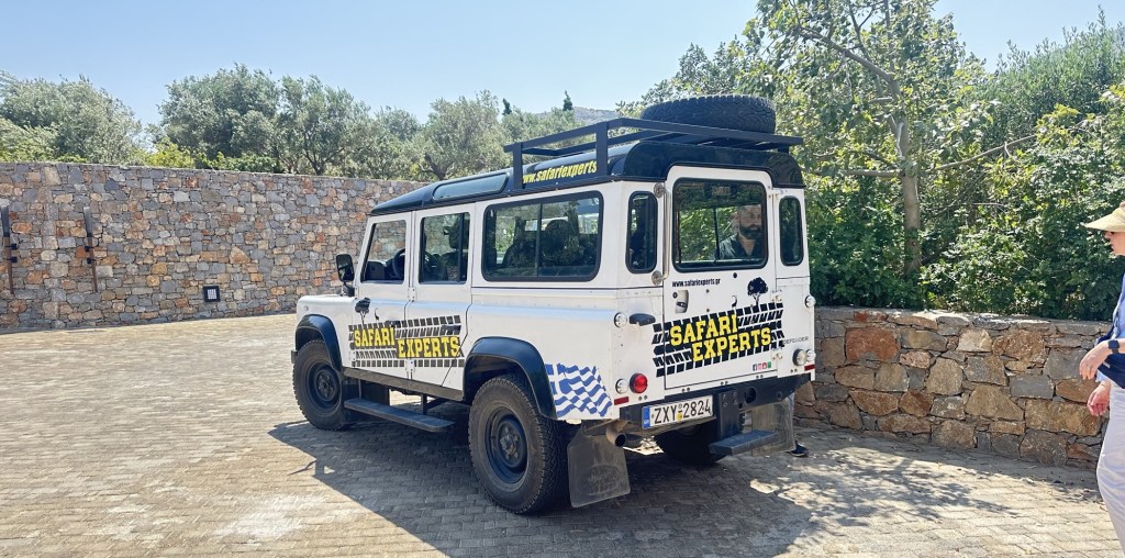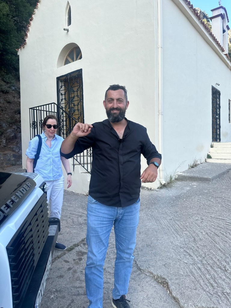 Back in the Defender again, a few miles later Demetrius veered off paved road onto a very bumpy mountain one. Driving a mountain road in Crete is an experience both exhilarating and humbling—a winding journey through the island’s raw, elemental heart. The road clings to the mountainside like a ribbon, narrow and often without guardrails, twisting around jagged cliffs and plunging ravines. As we climbed higher, olive groves give way to rocky outcrops, wild herbs scenting the air—thyme, oregano, sage—released by the heat of the sun. Goats appear like acrobats on the edges of steep inclines, impossibly balanced, indifferent to your cautious passing. Hairpin turns demand full attention, and the pace slows. Occasionally, we passed a faded shrine—small white boxes with blue crosses—marking a memory, a miracle. The road narrowed further, sometimes to a single lane, as if inviting us to slow down, to surrender to the rhythm of the land. It is not a road to rush. It is a path that demands respect—and in return, it reveals the soul of Crete: untamed, timeless, and quietly majestic. Demetrius knows each and every bump and turn, at times quite the showman.