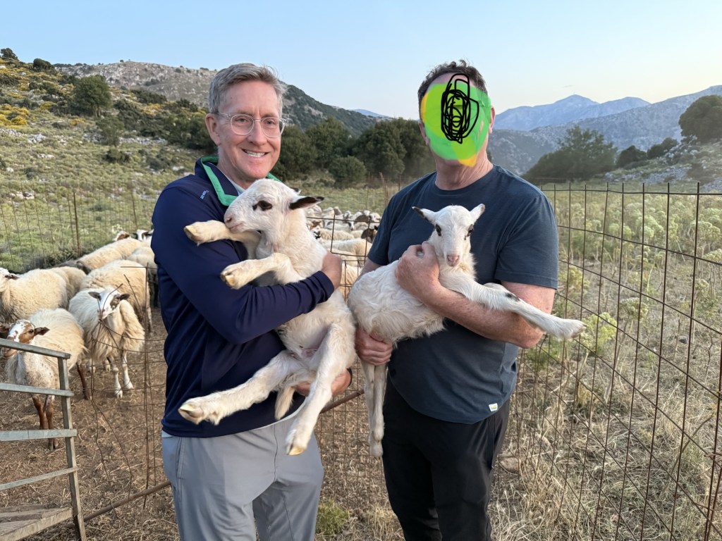 We watch as the milking process unfolds—efficient, practiced, and almost meditative. Then, with a twinkle in his eye, Haralabis’ grandson steps into the herd and gently lifts a few lambs, handing them off to us one by one. “Take them home,” he says with a grin, as if we could simply tuck them into our backpacks and carry them back across the world. The lambs are soft, warm, and a little bewildered—much like us. The moment is both surreal and deeply human, a reminder that here, hospitality extends beyond raki and cheese—it includes a lamb, if you’re willing.