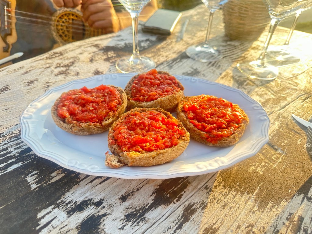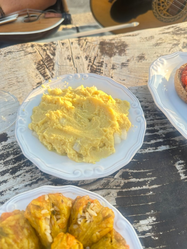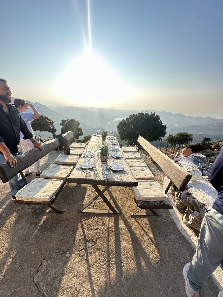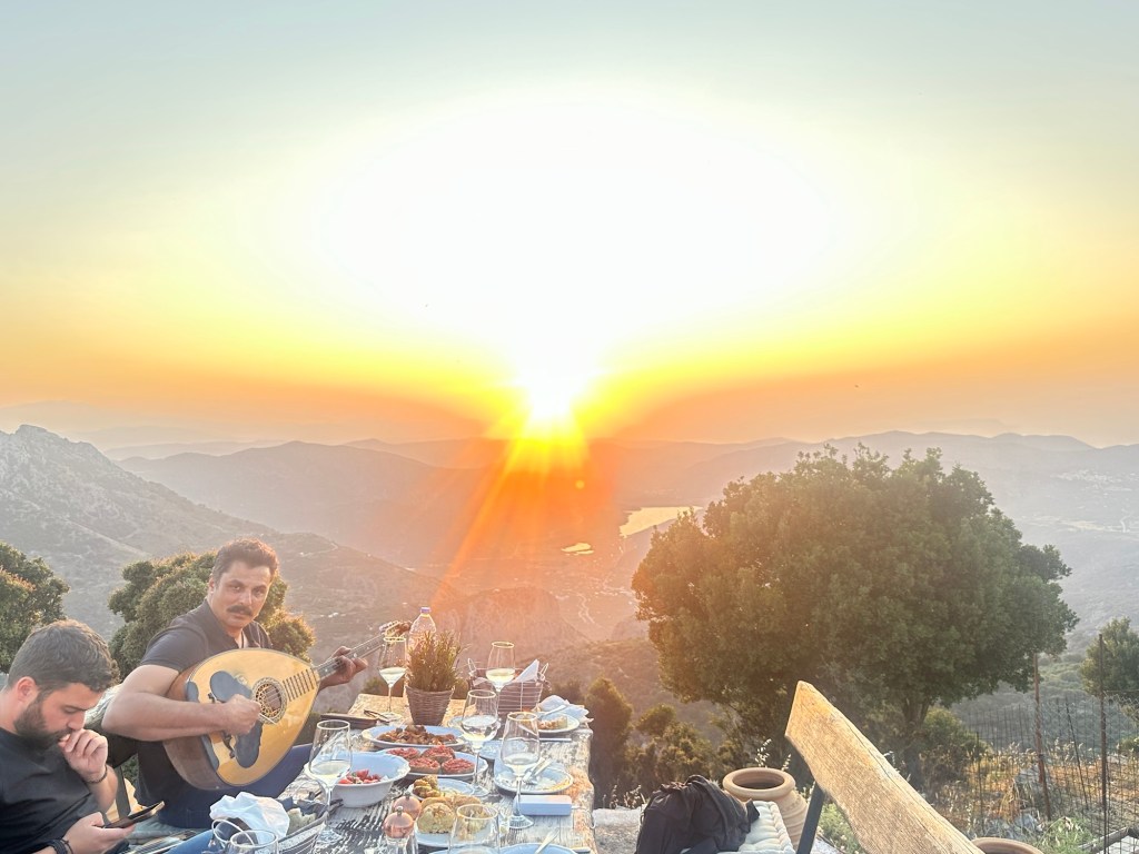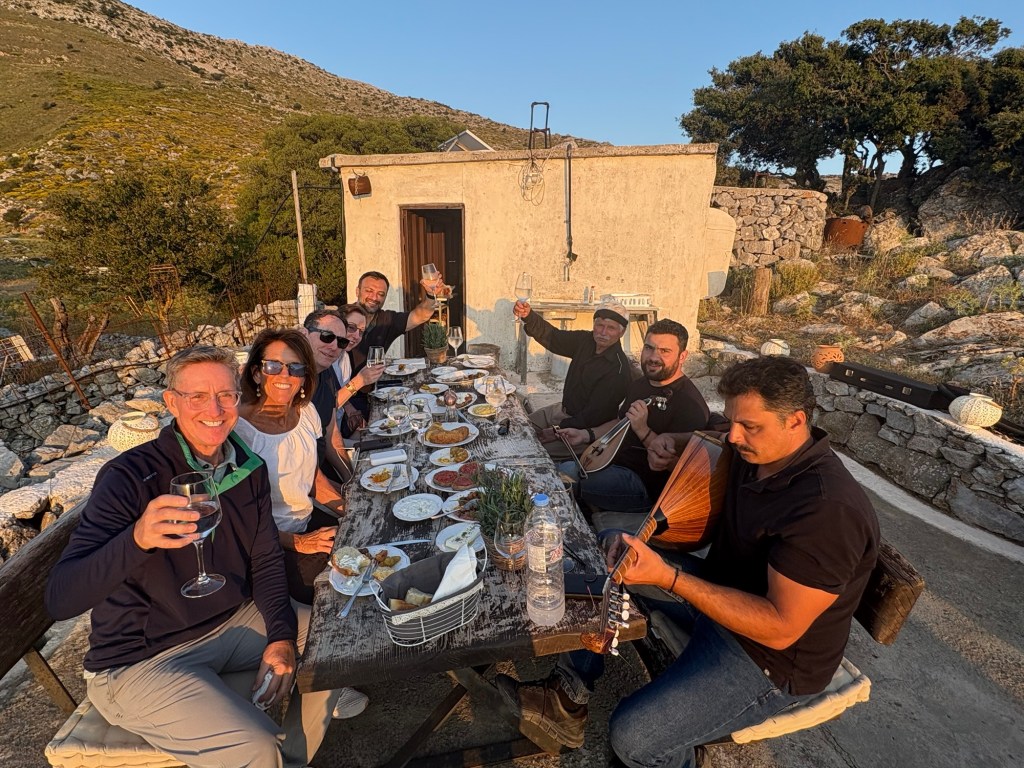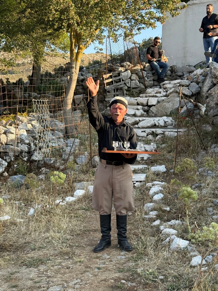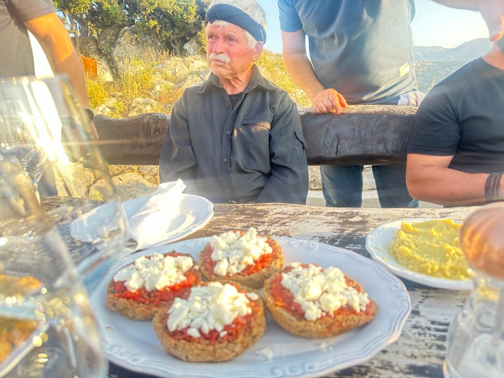 Up random stone stairs behind him, as if conjured from the land itself, two musicians (both named Manos) begin to play. One cradles a lyra, the iconic Cretan string instrument, its sound high and mournful, like wind through mountain pines. The moment is unexpected, intimate, and utterly magical. We step forward, drawn in by hospitality that feels older than the stones beneath our feet.