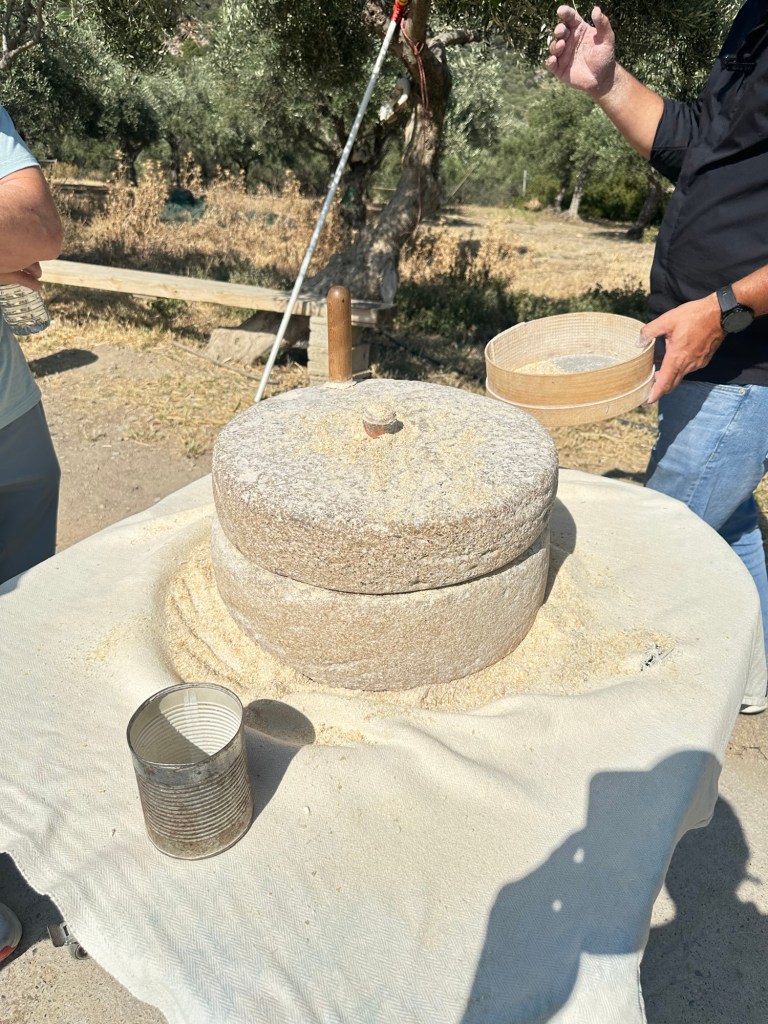 Our journey begins at a humble goat farm nestled in the hills, where we’re welcomed by a local farmer. We dip crusty bread into golden olive oil pressed from his own trees, learn the ancient rhythm of milling grain by hand, and share a quiet moment with Marguerite—the gentle goat who teaches us how to milk with patience and care.