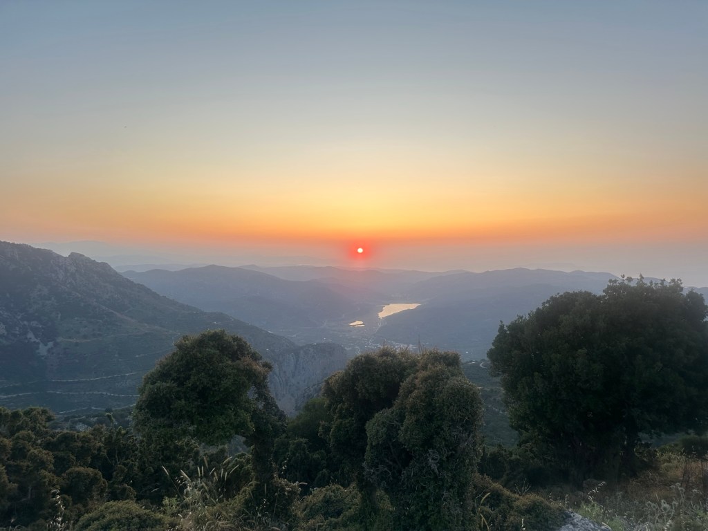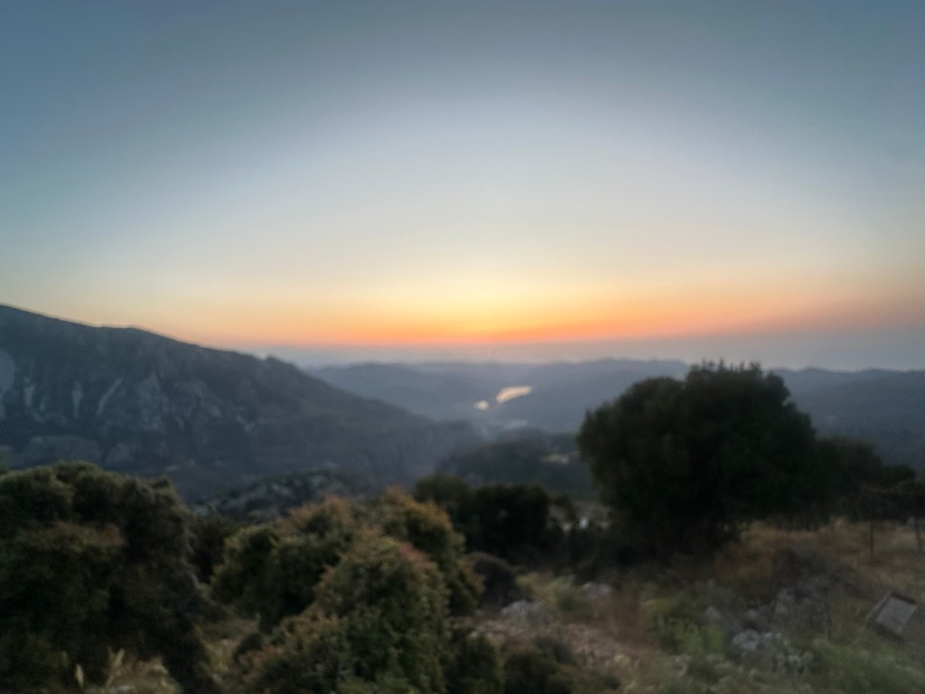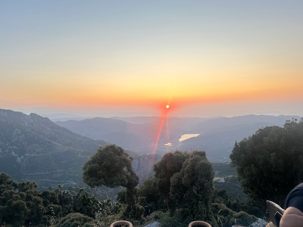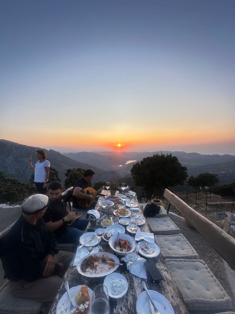We return to the table to finish dinner, the last of the dishes passed between us. Conversation softens as the sun begins its slow descent behind the hills of the mountain. The sky turns honeyed gold, then deep rose, casting long shadows across the stone terrace. We sit in quiet awe, glasses in hand, watching the day melt into evening. It’s not just a meal—it’s a memory, etched in the light of a Cretan sunset.