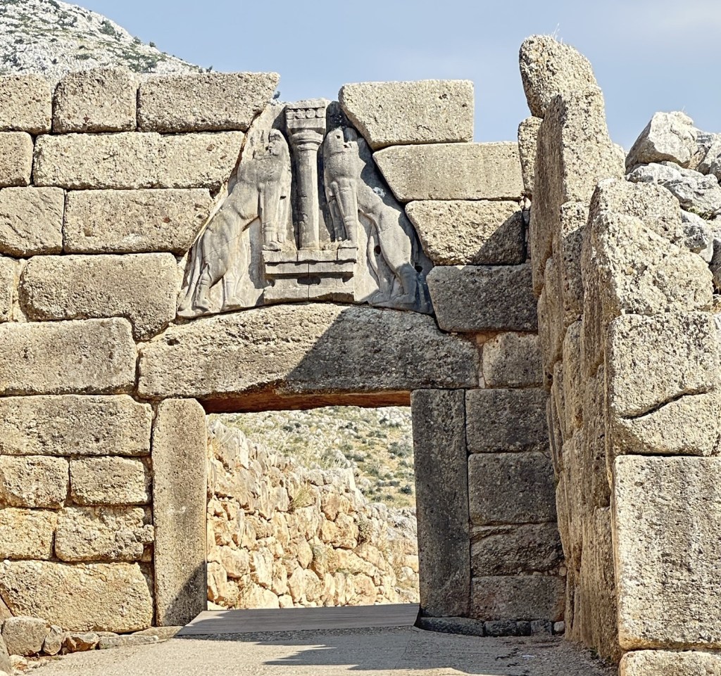The Citadel of Mycenae, the fortified palace complex that served as the political and military center of Mycenae is located next to the museum. As we approached the outer walls of Citadel is one of the most iconic symbols of ancient Greece: the Lion Gate. Built around 1250 BCE, this monumental entrance once marked the main gateway to the citadel. Two lions—now weathered but unmistakable—stand in high relief above the lintel, flanking a column that likely symbolized divine or royal power. Notably, the Lions’ heads which were said to be made of gold are missing.