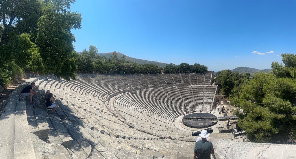 From up high, the view was majestic. The semicircle of limestone seats fanned out perfectly below us, embracing the stage like a stone ripple. Even from that distance, we could hear the soft voices of visitors on the ground—a testament to the theater’s legendary acoustics. Built in the 4th century BCE, it was designed not just for drama, but for healing. The performances were part of the therapeutic experience for those seeking cures at the sanctuary of Asklepios, the ancient god of medicine.