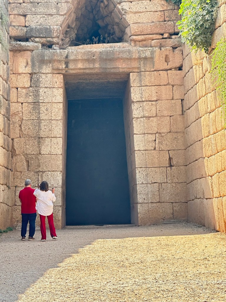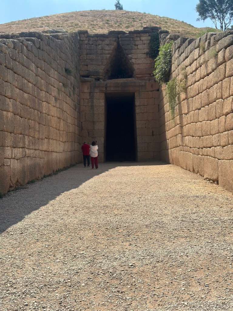 After a quick bite to eat in Nafplio, we drove a short distance to Mycenae, in the northeastern Peloponnese—one of the most important archaeological sites in Greece, steeped in myth and the early history of Ancient Greece. Our first stop was the imposing Treasury of Atreus, also known as the Tomb of Agamemnon, a monumental tholos tomb dating to around 1250 BCE. Though neither Atreus nor Agamemnon was actually buried here—those names are mythological—the scale and craftsmanship of the tomb reflect the immense wealth and power of the Mycenaean elite.