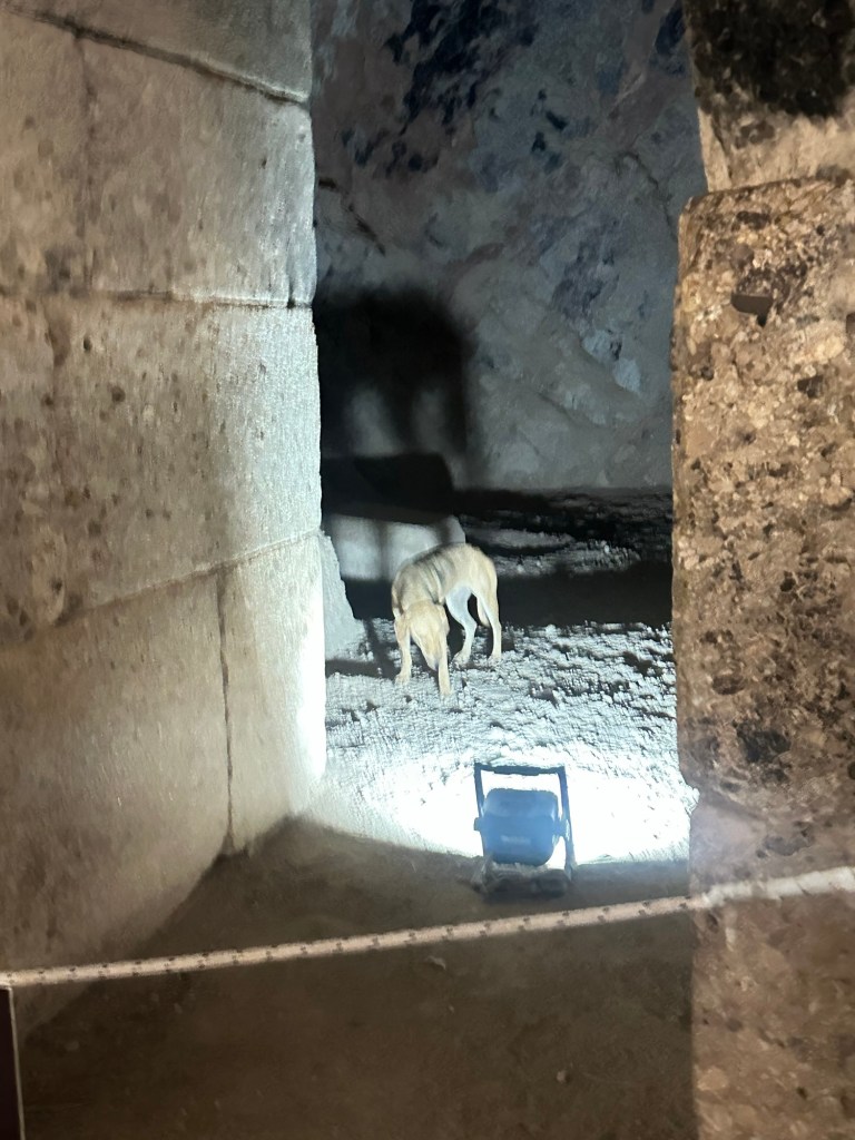 The towering tomb is carved into the hillside, its massive stone passage leading to a dark, monumental doorway—an entrance fit for myth. Inside, the beehive-shaped dome rises nearly 50 feet overhead, constructed without mortar, each stone precisely placed. Though long stripped of its treasures, the tomb still radiates power, silence, and the weight of a civilization that once ruled the Aegean. In one quiet area, a dog has made its home—cared for by the staff who watch over this ancient place.