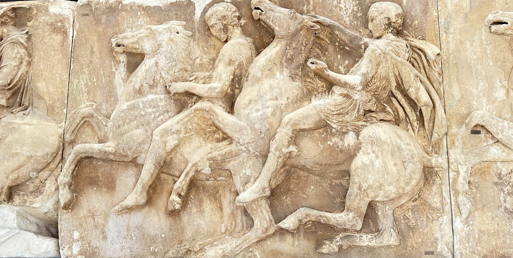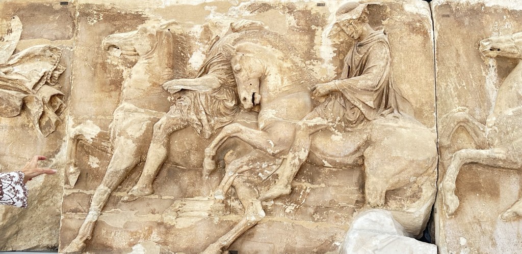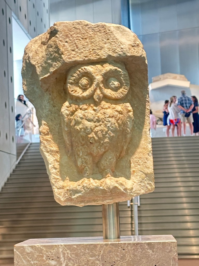 To beat the afternoon heat, Eleni began our visit at the Acropolis Museum, where we spent a considerable amount of time absorbing the rich history and insights she shared. The museum itself is a minimalist architectural masterpiece, designed by architects Bernard Tschumi and Michael Photiadis. The museum is a kind of temple, not of worship, but of memory, light, and cultural identity. It bridges the ancient and the modern worlds, the local and the universal, the seen and the missing.
