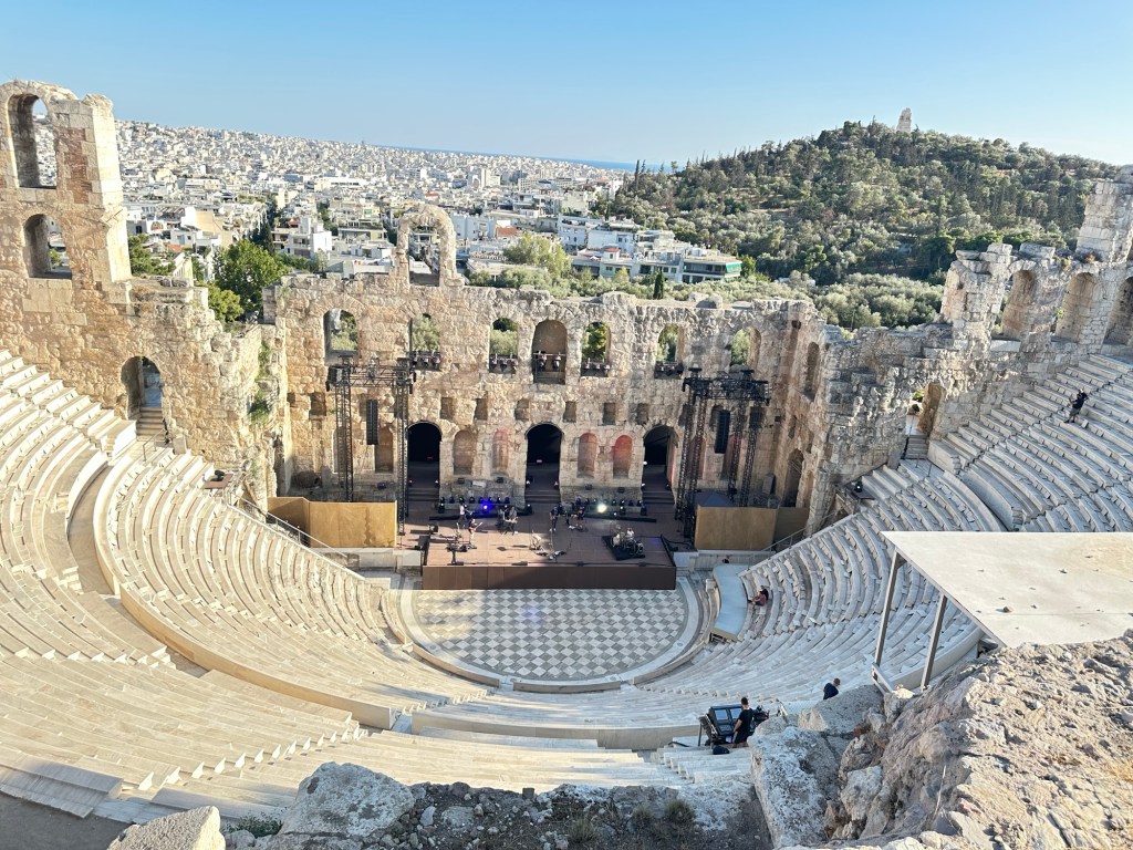 As Eleni led us to the Acropolis, our first stop was the Odeon of Herodes Atticus (Herodeon), an open-air theater built into the southwest slope of the Acropolis, dating back to 161 CE. Remarkably, this ancient venue is still in use today, hosting concerts and performances—even as it undergoes careful restoration work.