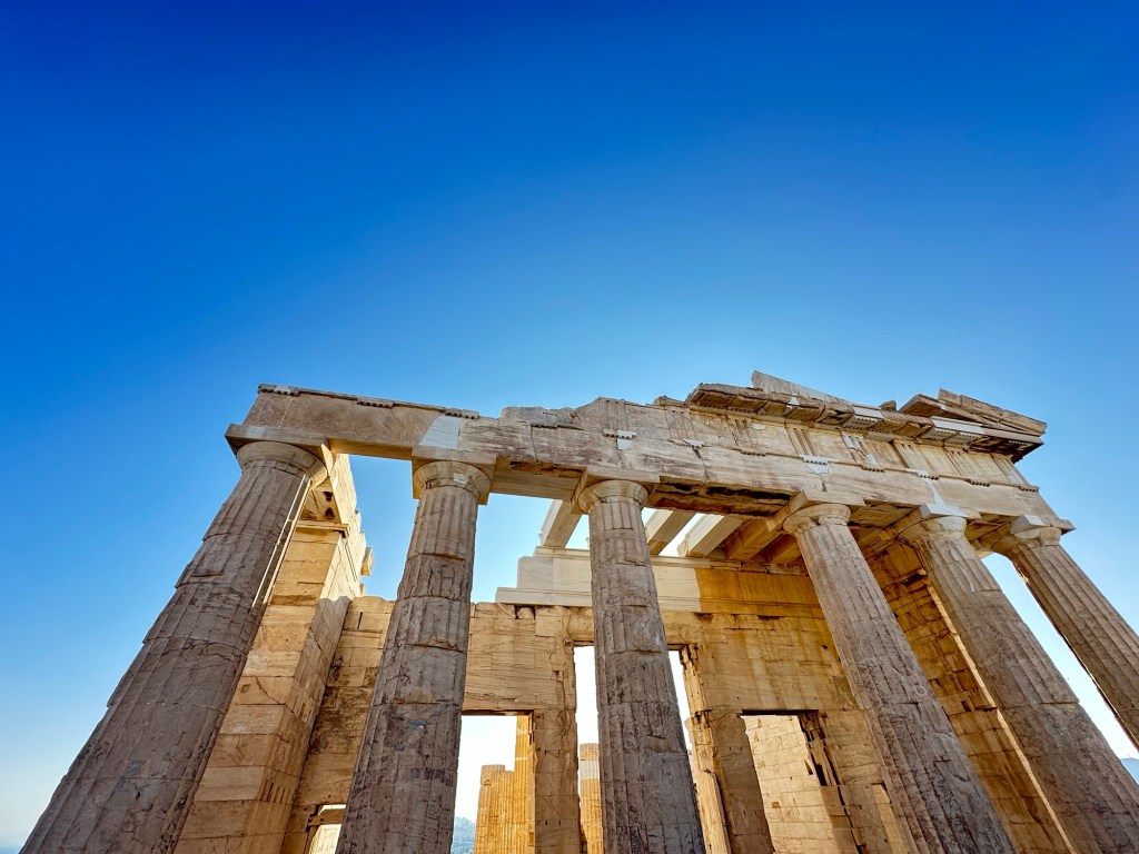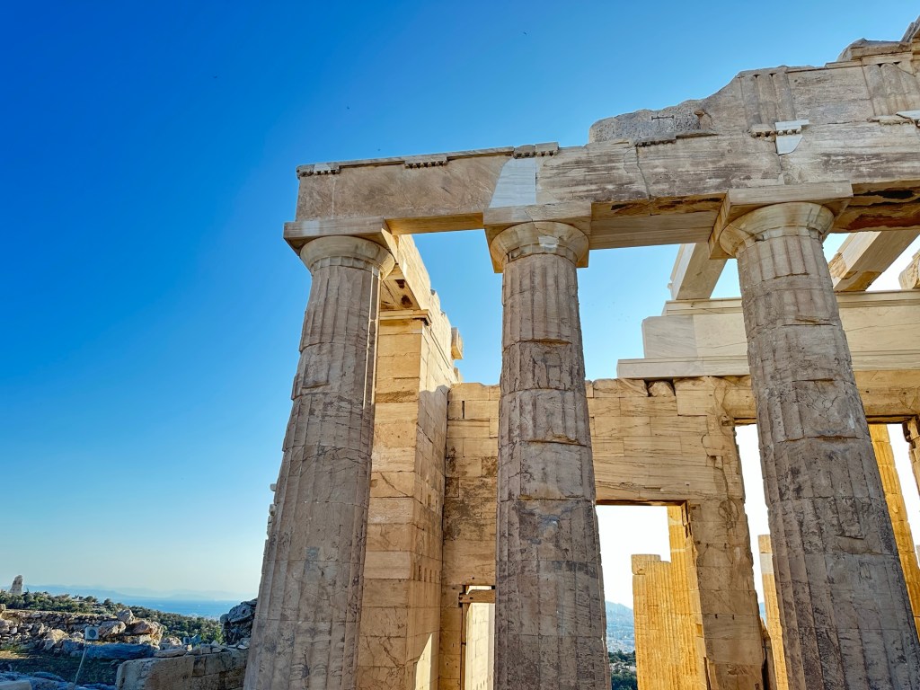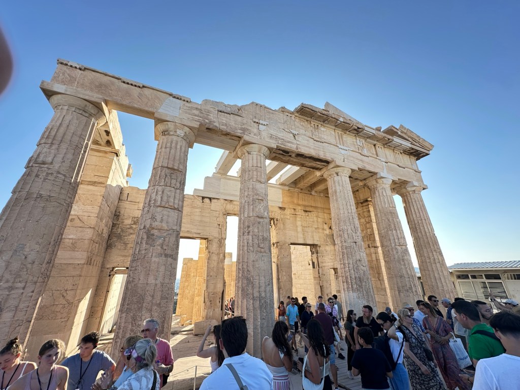 The walk up to the Acropolis is both humbling and exhilarating. The marble steps—worn smooth and uneven from centuries of footfall—glint in the sun, making careful footing essential. Around us, the wind carries echoes of the past, rustling through the olive trees and whistling between the columns that crown the hill. As we climb higher, the modern city of Athens begins to fall away, replaced by a growing sense of awe and anticipation. The gleaming columns of the Propylaea, the monumental gateway, slowly come into view, standing as a grand threshold to the sacred plateau above. Each step feels like a passage through time—closer to the gods, closer to the cradle of Western civilization.