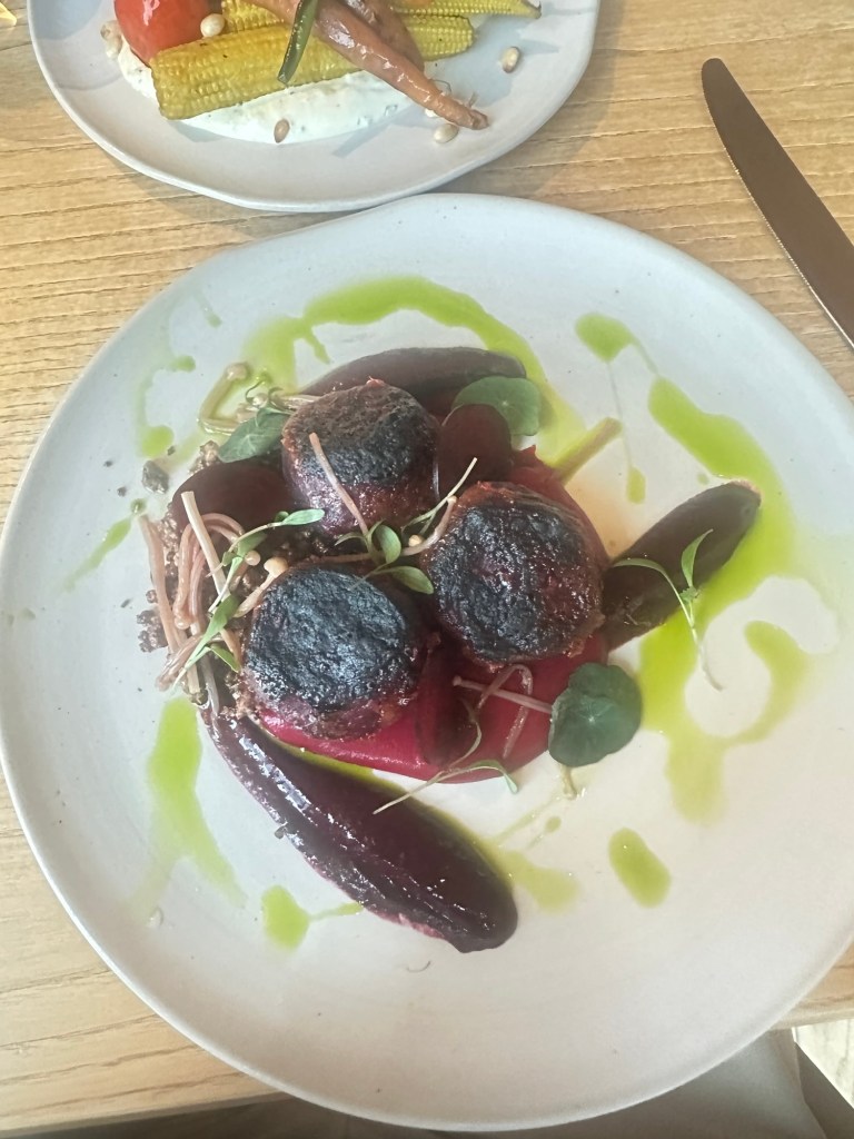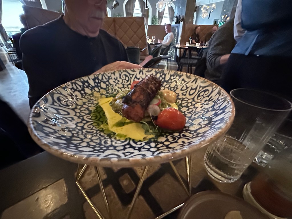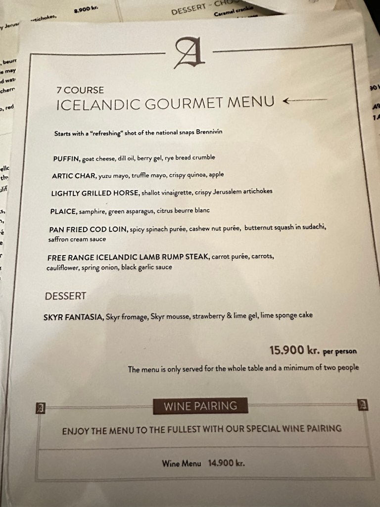 After returning from the Hot Springs, we had a wonderful dinner at Apótek. Located in a grand former pharmacy in the heart of downtown Reykjavík, Apótek is where old-world elegance meets contemporary Icelandic cuisine. The space retains its historic charm—arched windows, marble staircases, and high coffered ceilings—while sleek furnishings and moody lighting give it a cosmopolitan edge. Not one of us ordered their horse, a popular Icelandic dish.