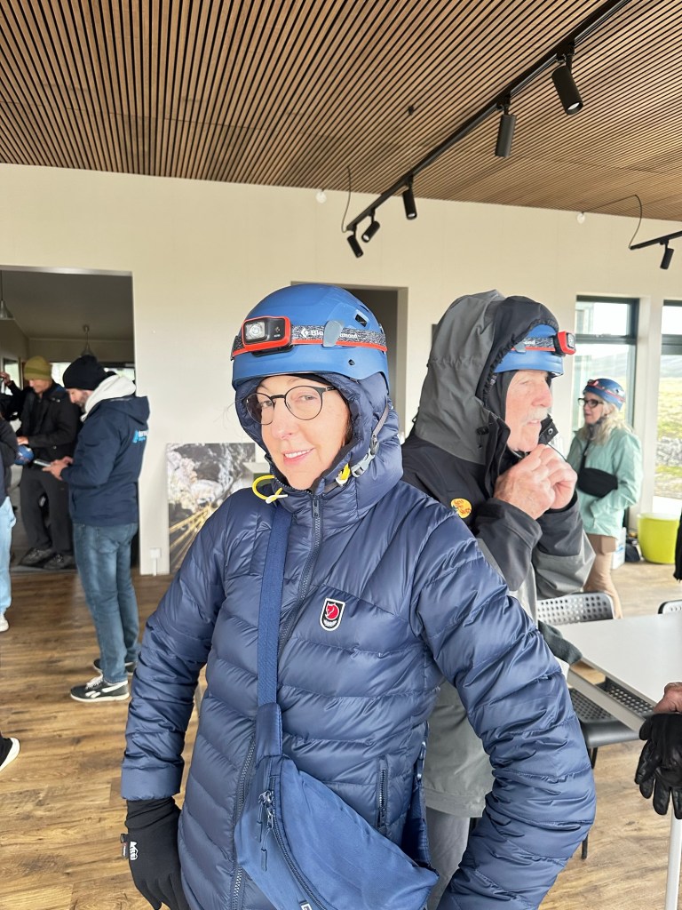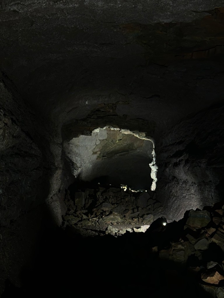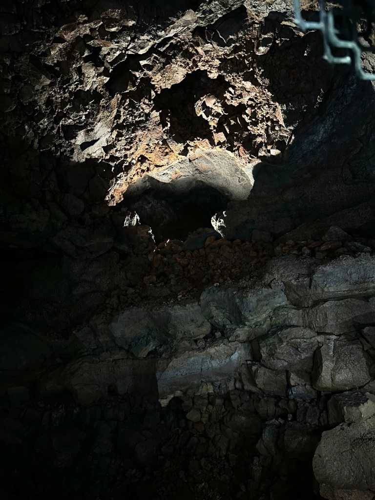 At one point, we reached a section Anna, our guide, cheerfully called “the squeeze”—an apt name for a narrow stretch where the lava tube’s ceiling dips dramatically. Unlike the lofty chambers we’d passed earlier, this part demanded a slow crouch and careful footing. I nearly tripped on the green safety mat rolled out over the volcanic floor. My helmet scraped against the rock more times than I could count—a rhythmic reminder of just how close the Earth was above me. Thank goodness for helmets. Without one, I might have come away with more than just memories.