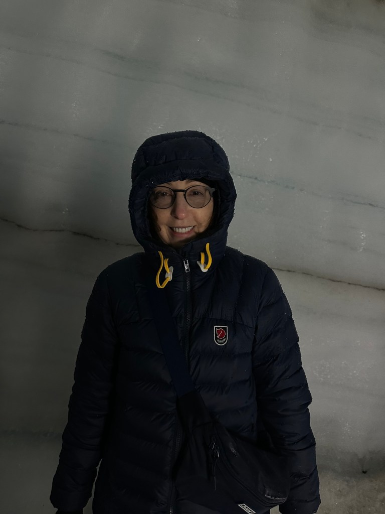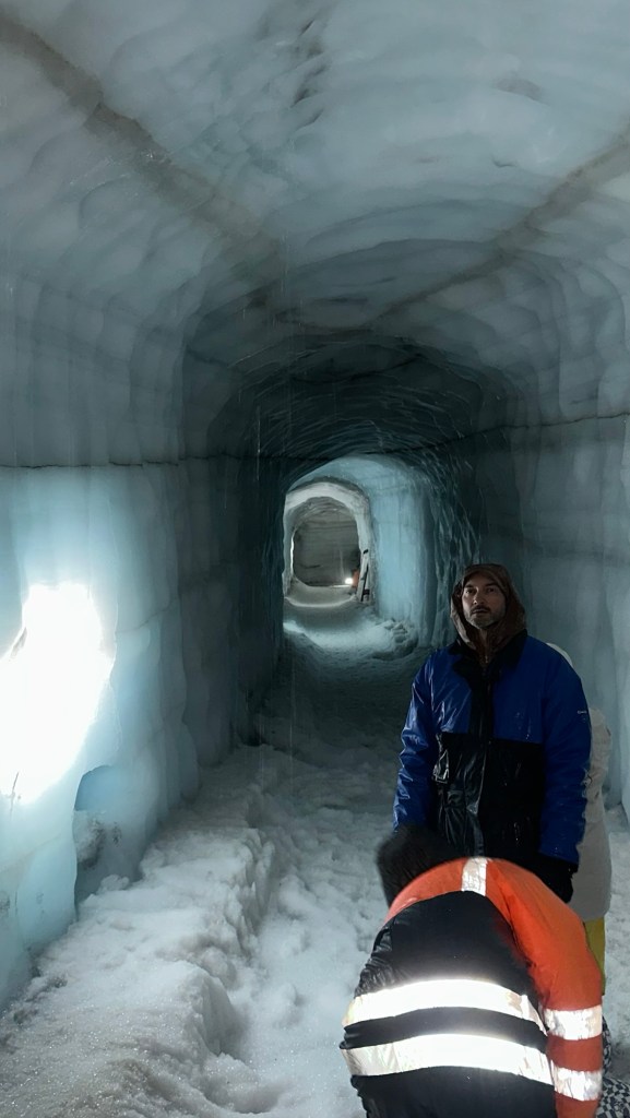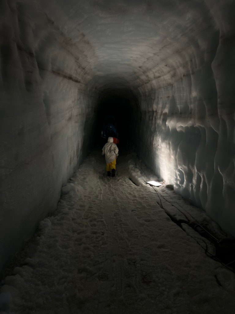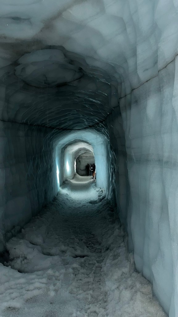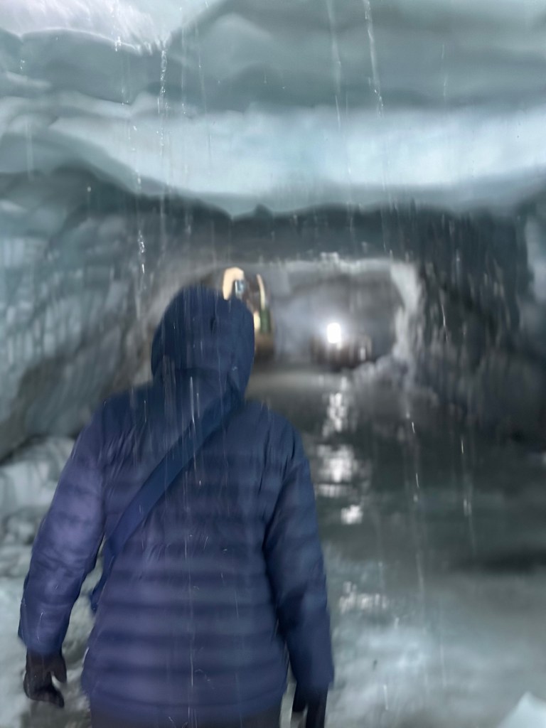 Inside the glacier, the world turned cold, blue, and surreal. The tunnel curved ahead in a soft glow, its walls layered with centuries of compressed ice. But instead of crisp stillness, we found wet slush underfoot, with meltwater dripping and pouring from the ceiling. The floor was slick, the air heavy with moisture. It was both stunning and disorienting—a reminder that this ancient glacier is not frozen in time, but quietly slipping away.