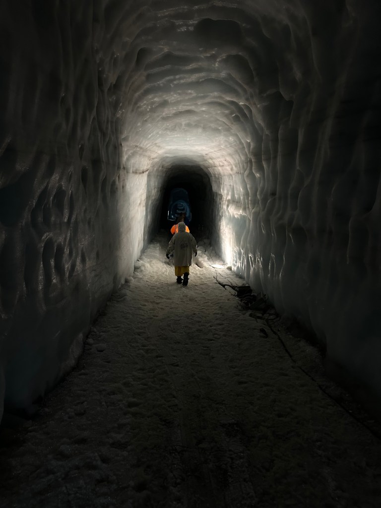 Climbing down from our gargantuan ride, we spotted the tunnel entrance about fifty feet away: a low, corrugated pipe embedded in the glacier, looking more like a makeshift emergency hatch than the gateway to an extraordinary experience. Under ordinary conditions, it would’ve been a short, unremarkable walk.