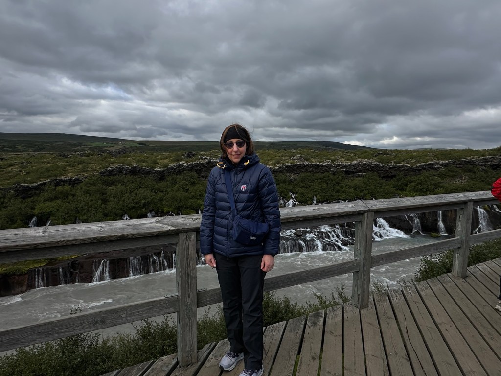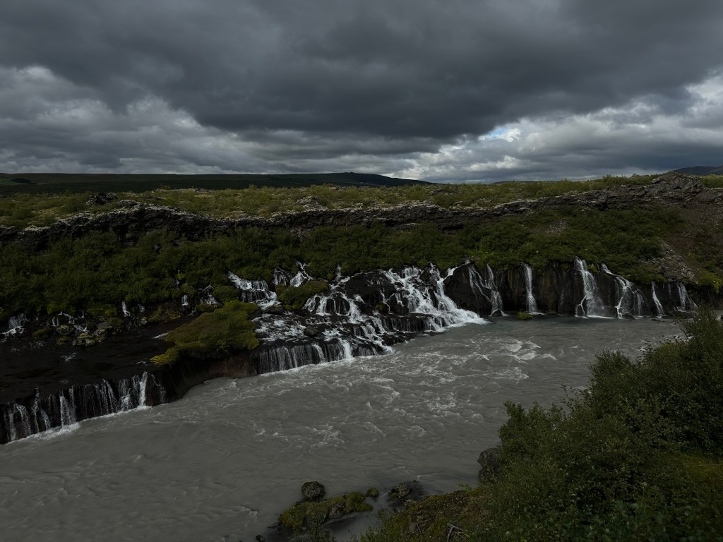 Our final stop of the day was Hraunfossar, a waterfall unlike any we’d seen before. Instead of crashing over a cliff’s edge, it emerged gently and almost mysteriously—from beneath a wide expanse of lava rock. Dozens of clear, cold rivulets streamed out from under the moss-covered basalt, spilling into the Hvítá River in a series of delicate, shimmering veils.
