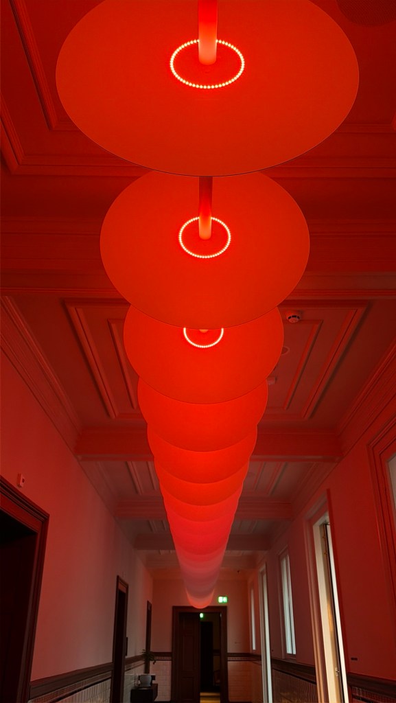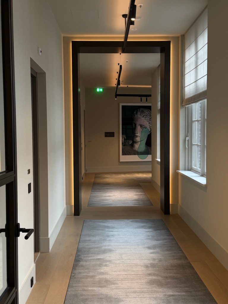 Art is woven into the hotel itself. You encounter it in hallways, in quiet corners of the lobby, along staircases, even in transitional spaces you might otherwise pass through without thinking. It doesn’t announce itself loudly. There are no crowds, no sense of “now you are entering the gallery.” Instead, it reveals itself gradually.