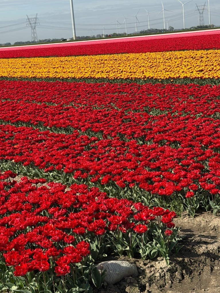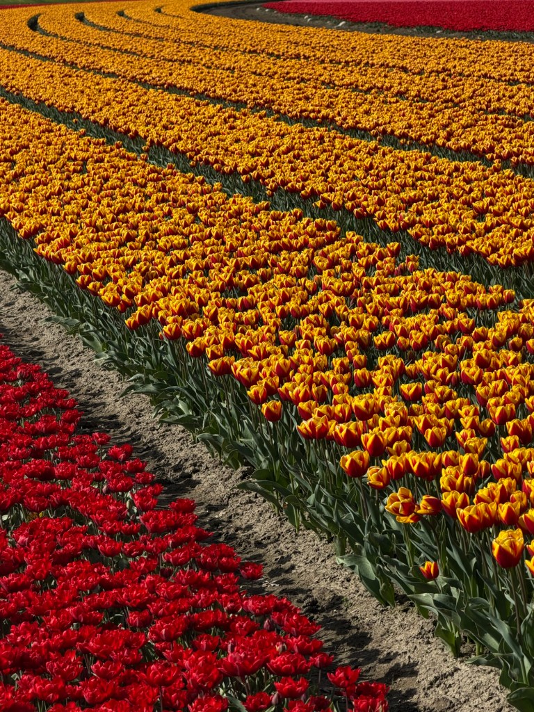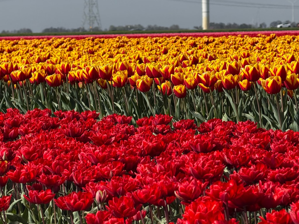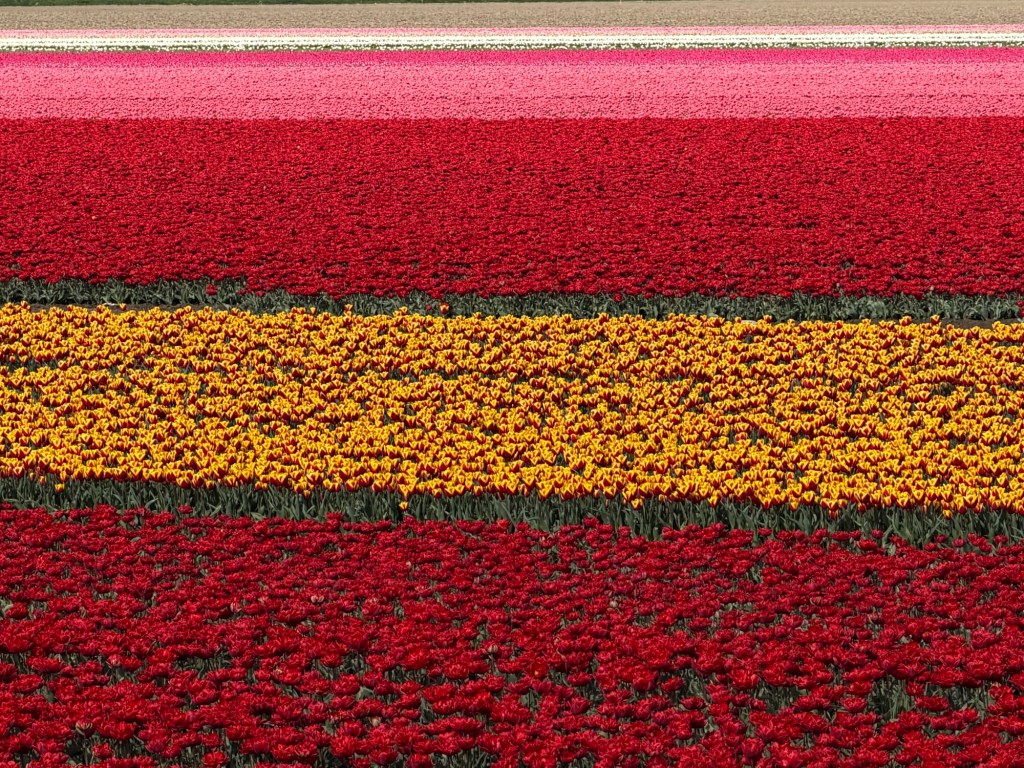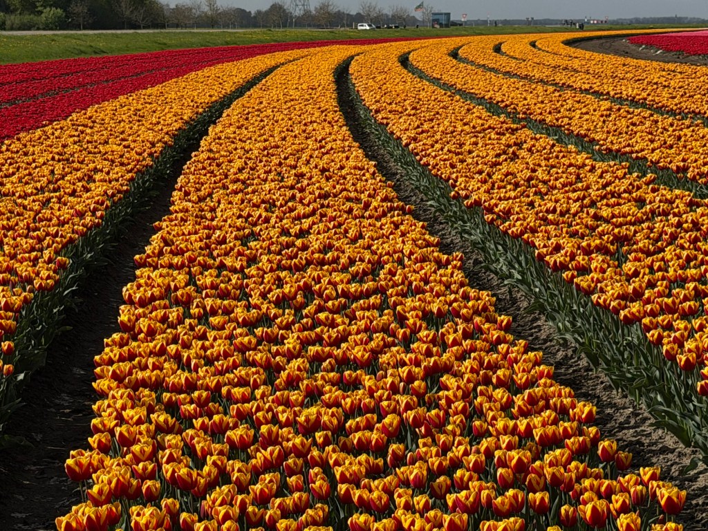 These aren’t gardens. There are no winding paths or curated displays. This is the Noordoostpolder, where tulips are grown as a crop, not arranged for visitors. The beauty feels incidental, almost accidental—something that happens when purpose and scale align.