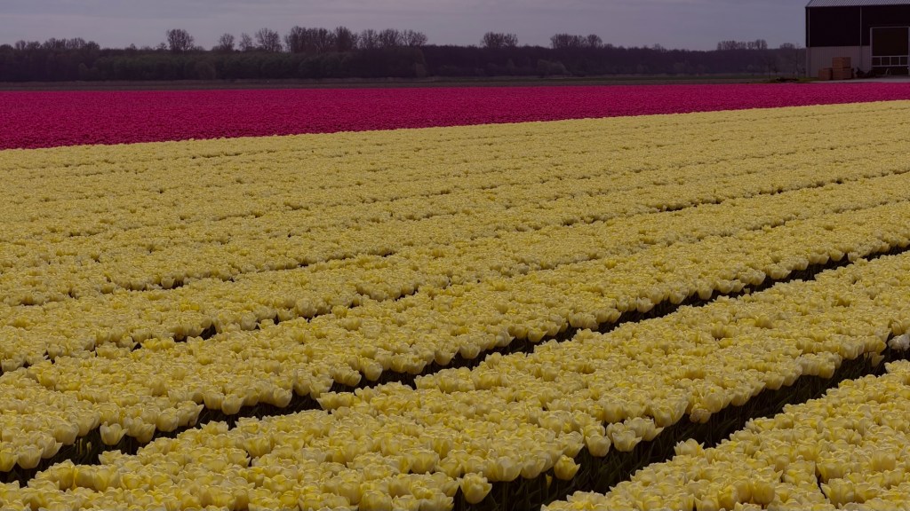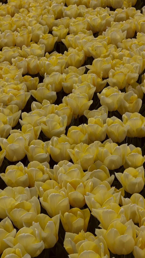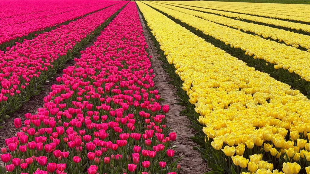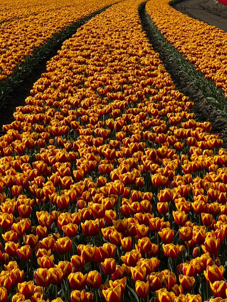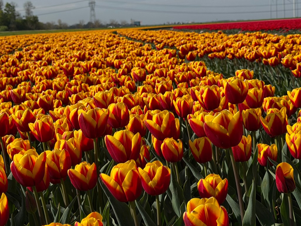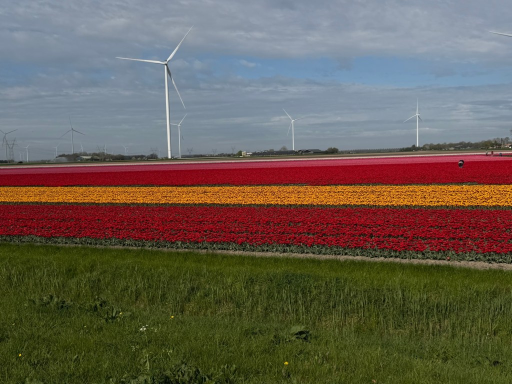 These aren’t gardens. There are no winding paths or curated displays. This is the Noordoostpolder, where tulips are grown as a crop, not arranged for visitors. The beauty feels incidental, almost accidental—something that happens when purpose and scale align.