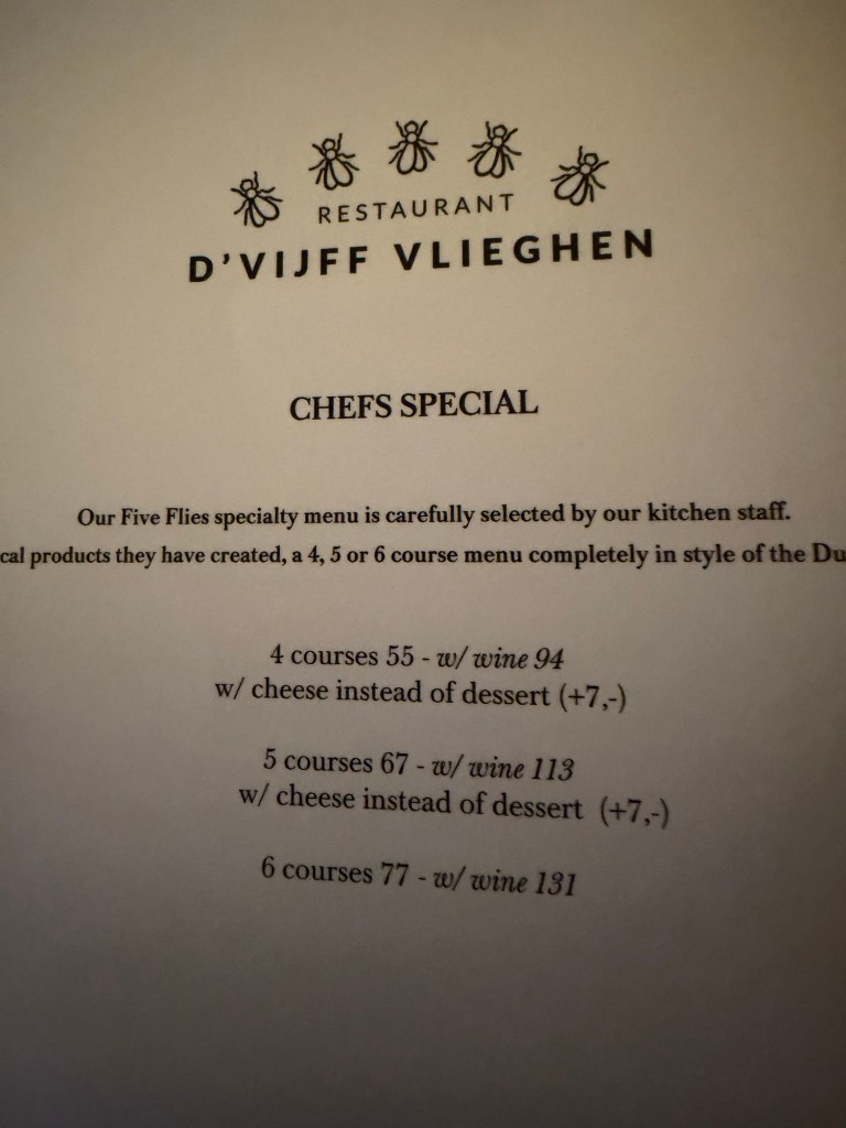 At the end of a longish day, we had dinner at D’Vijff Vlieghen (“The Five Flies”), an Amsterdam institution for more than 85 years.