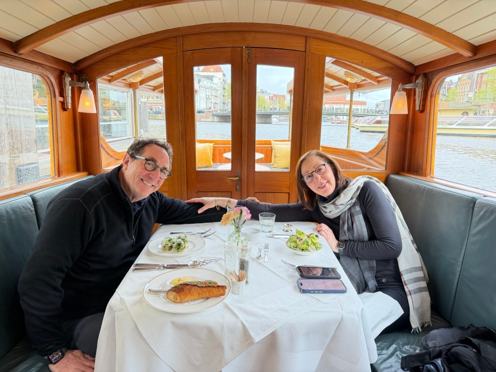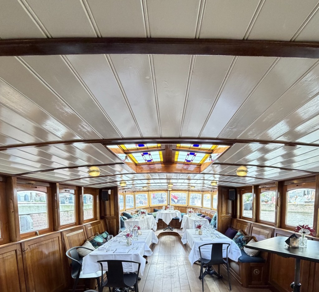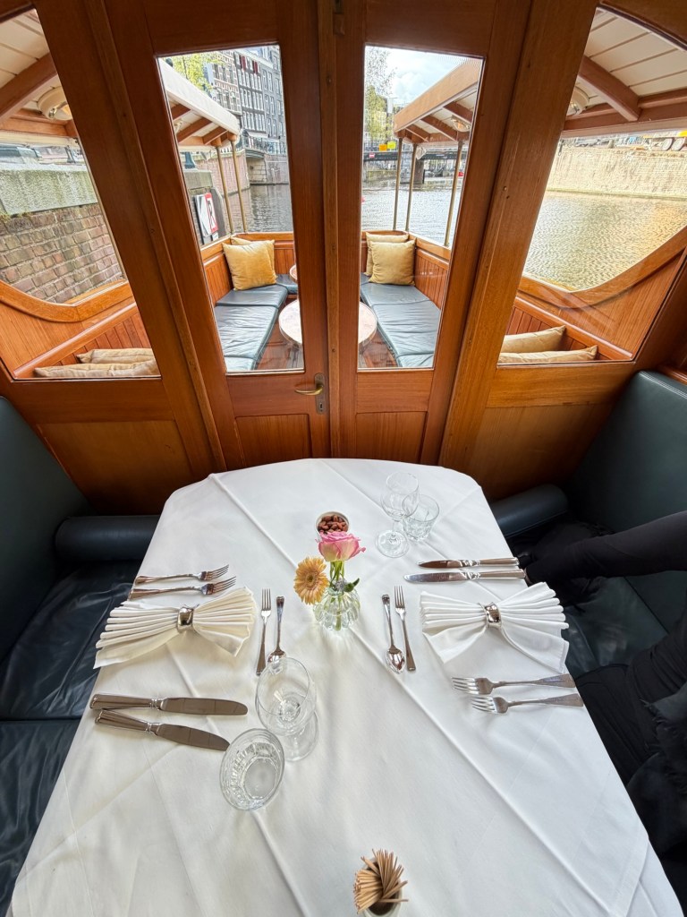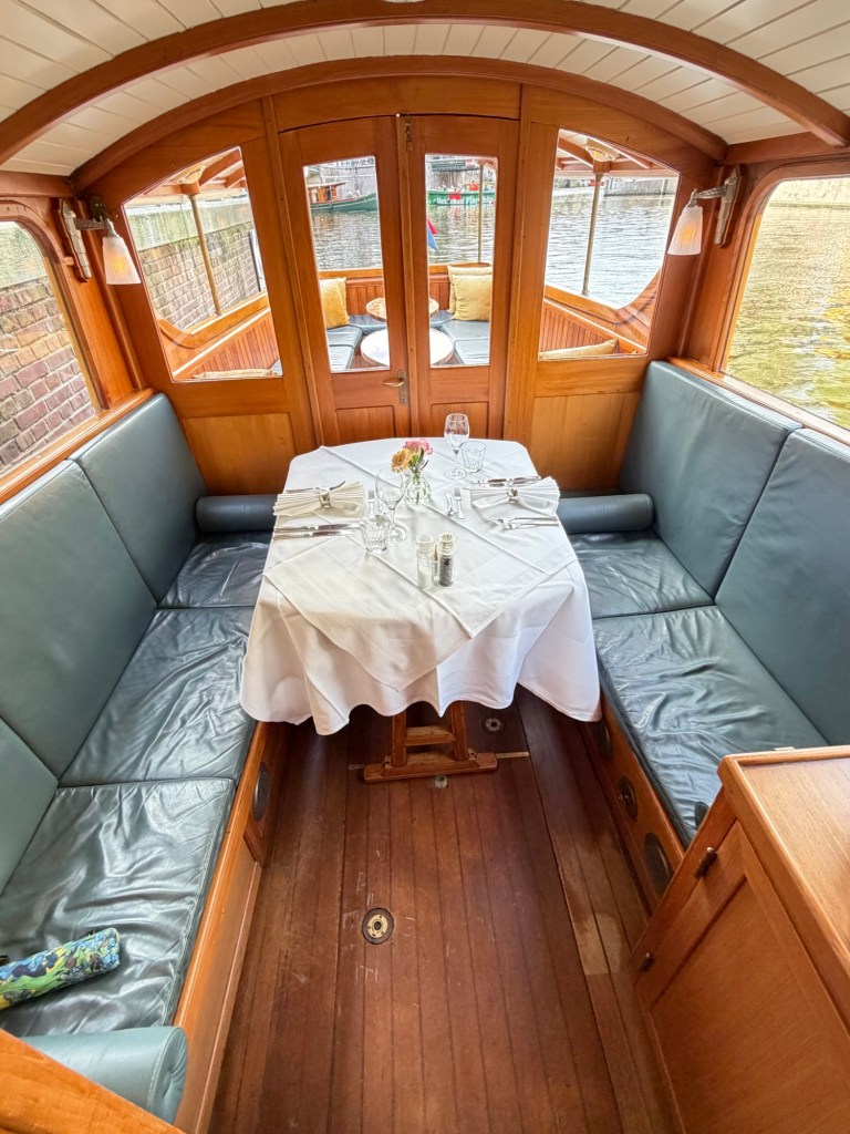 Stepping inside, the intimate scale of the boat became clear. The warm glow of varnished wood surrounded us—polished cabinetry, curved beams, and large windows framing the canals like moving paintings. Our table was set simply but elegantly: crisp white linens, neatly folded napkins, polished silver, and a small vase with fresh flowers at its center. It was unmistakably designed for two.