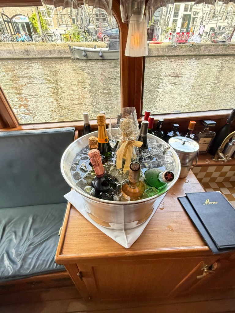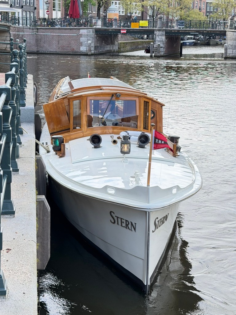 Sleek and intimate, with a gleaming white hull and warm varnished wood cabin, she felt worlds apart from the bustling dinner barge we had just left. The name Stern was painted neatly across the bow, a small Dutch flag fluttering at the front, adding a quiet sense of place. Moored gently along the canal’s edge, she seemed to promise exactly what we had envisioned all along: a private, unhurried evening on the water, set against the timeless backdrop of Amsterdam’s bridges and narrow streets.