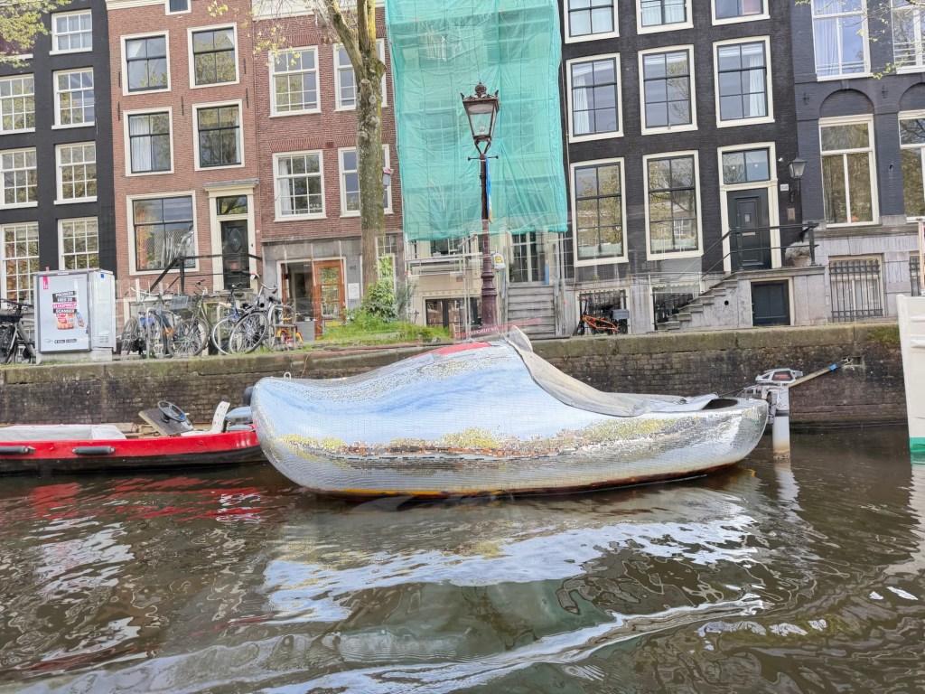 At one point, we passed a curious sight: a boat clad entirely in mirrored tiles, shimmering softly in the water, reflecting the city back in fragments as we glided by.
