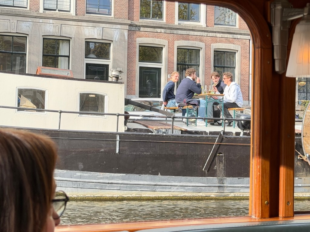 Along the banks, the narrow canal houses stood shoulder to shoulder—brick facades in varying shades, some pristine, others wrapped in scaffolding, quietly revealing the ongoing effort to preserve centuries of history. One of the more striking features was the number of houseboats—many of them beautifully kept, with potted plants, outdoor seating, and even small rooftop gardens. What might once have been working vessels have been thoughtfully transformed into full-time homes, each with its own personality. Drifting past them offered a glimpse into a quieter, more intimate side of Amsterdam life, where the water isn’t just scenery, but an address.