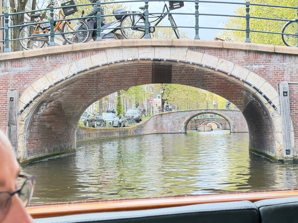 As we eased into the canals, Amsterdam unfolded around us in a way that felt both intimate and cinematic. Low stone bridges arched overhead one after another, each framing the next stretch of water like a carefully composed photograph. Bicycles lined the railings above, their silhouettes a constant reminder of the city’s rhythm just beyond the canal’s edge.