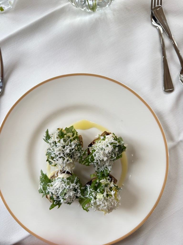 The first course arrived with a quiet elegance—artichoke hearts, lightly charred and arranged with precision, topped with a delicate tangle of greens and a generous shaving of cheese, finished with a drizzle of golden oil. Simple in appearance, yet layered in flavor.
