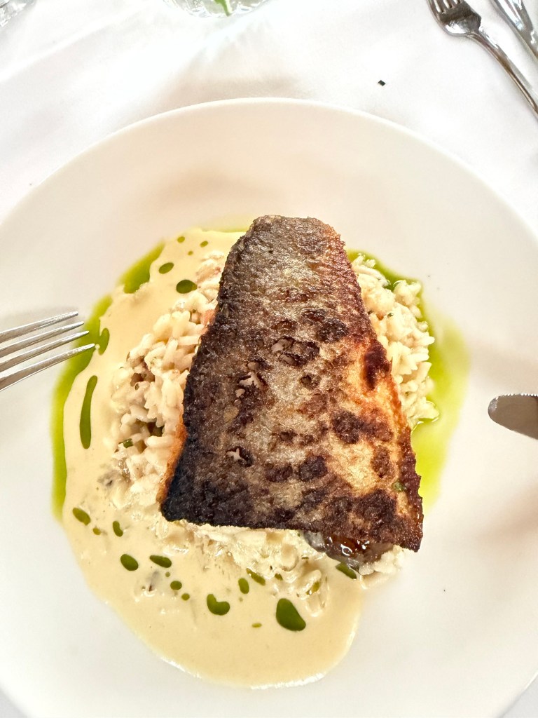 My sea bass was beautifully prepared, the skin crisp and golden, resting atop a creamy risotto. The sweetness of the honey tomatoes and the briny lift of the taggiasca olive salsa brought brightness and balance, making each bite feel light yet satisfying.
