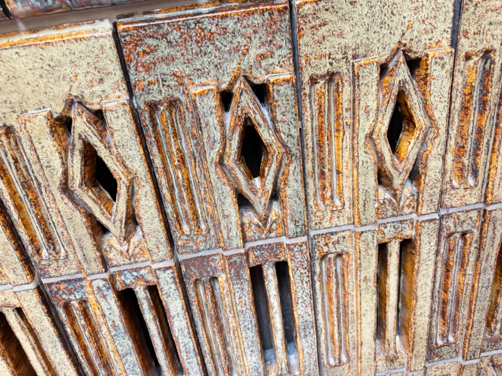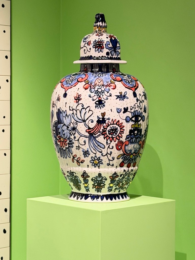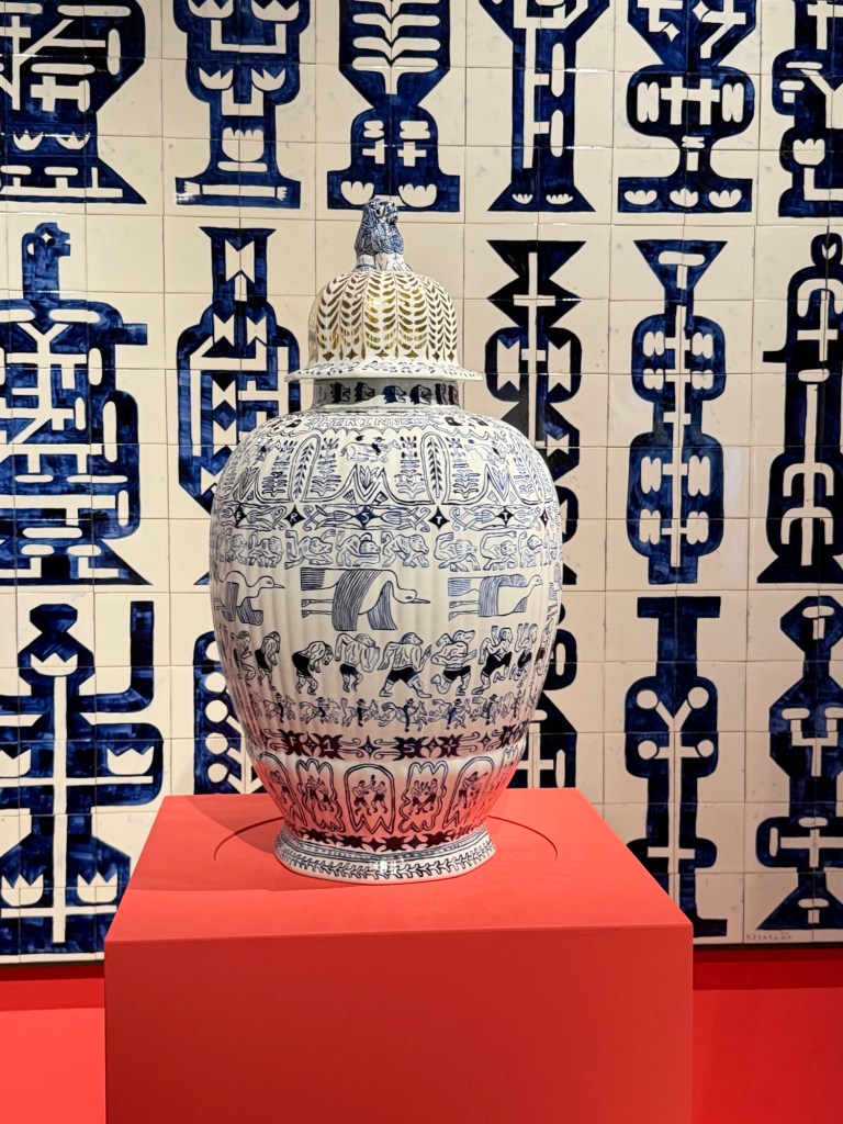 One piece caught my eye: a striking lidded vase that felt both ancient and completely modern. Its blue-and-white surface is filled with intricate, almost graphic patterns—figures, animals, and symbols arranged in bands that echo traditional Delftware, yet with a bold, contemporary edge. Set against a backdrop of oversized tile motifs, it becomes clear that Royal Delft isn’t just preserving history—it’s actively reinterpreting it.