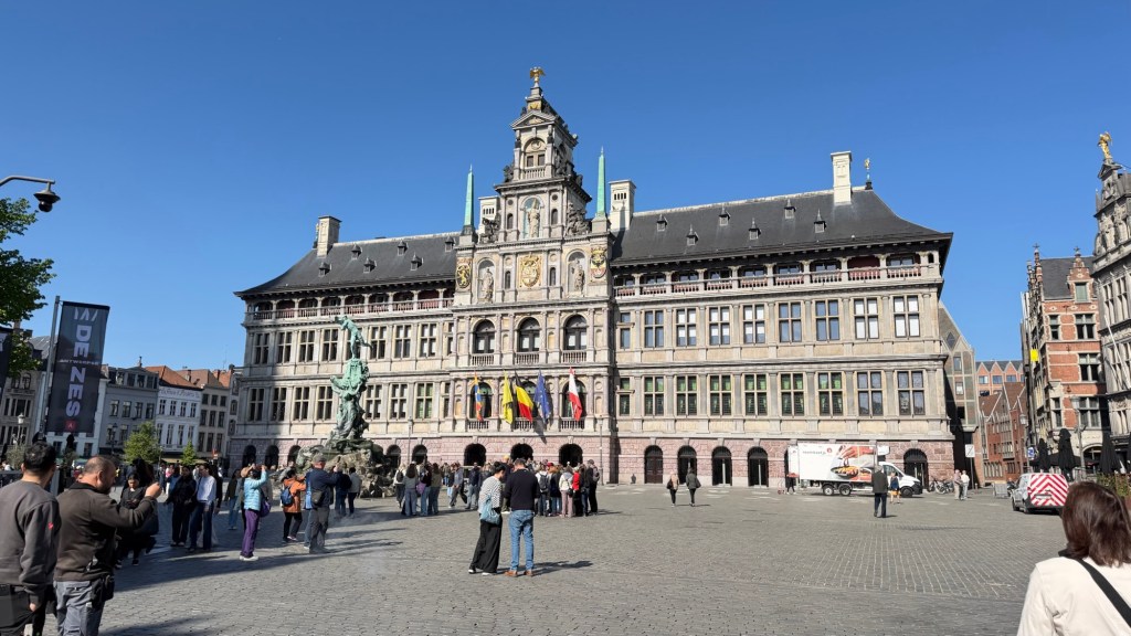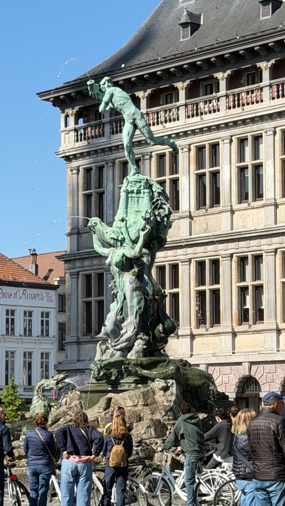 At the center stands the Brabo Fountain, depicting the legendary Roman soldier who cut off the hand of a giant and threw it into the river—an origin story for the name “Antwerp.”