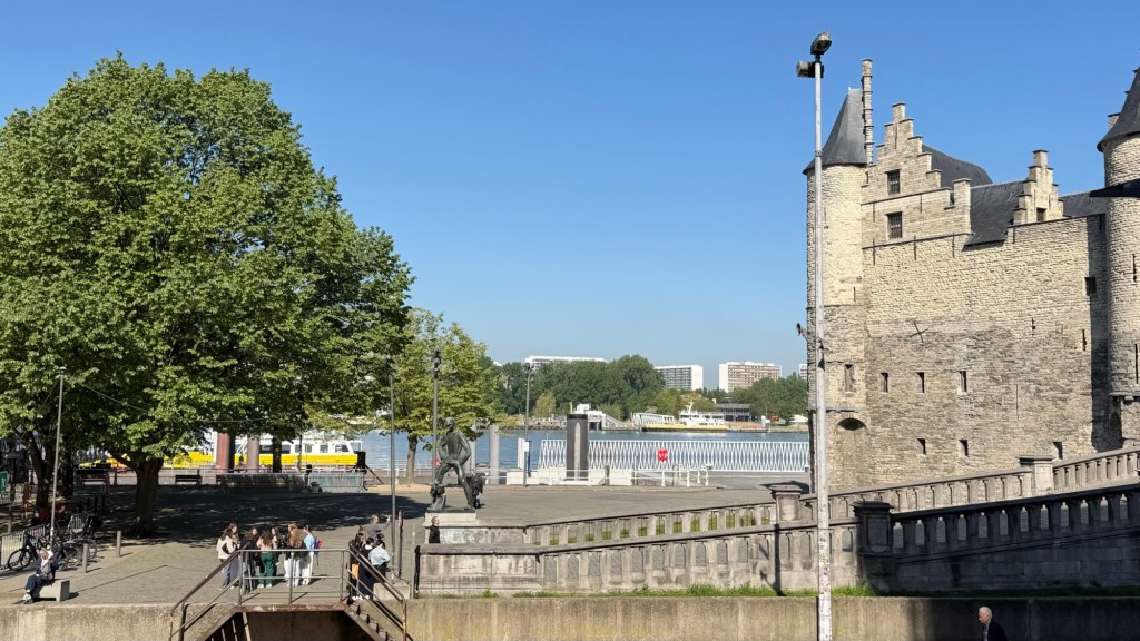 From there, we made our way down to the Scheldt River. Standing along the water, Herman shifted from legend to geopolitics, explaining how control of the river—and access to the sea—determined Antwerp’s fortunes over centuries, up to the present. Nearby sits Het Steen, the city’s oldest building, which has served as a fortress, a prison, and now a kind of historical anchor along the waterfront.